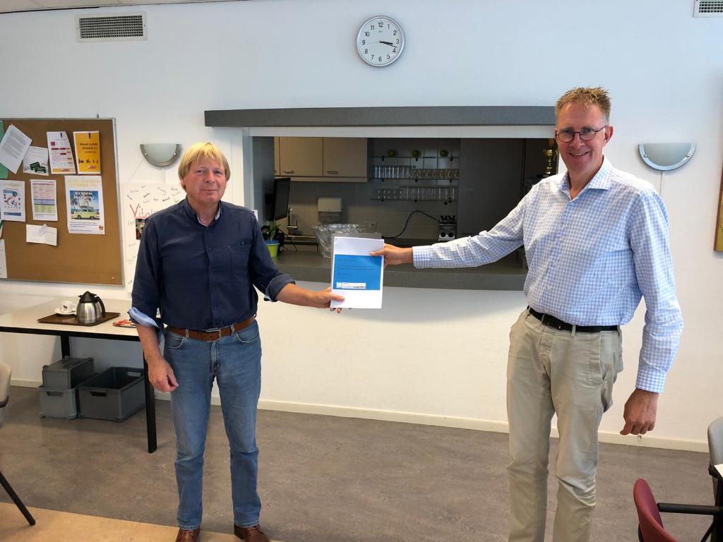 Bart Haaksman van de Werkgroep Veilig Benedeneind biedt wethouder Spelt van Lopik het plan van aanpak Natuurlijk Sturen Benedeneind aan.