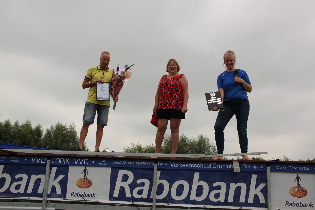 Ook bij de dames was het een erg spannende strijd. Hier eiste Julia van Eijk (Haastrecht) opnieuw zien dit jaar goed in vorm te zijn. Al in haar eerste sprong zette zij een nieuw persoonlijk record neer van 14.77 meter. Thuisspringster Fabienne Overbeek (Benschop) kwam in haar tweede sprong vlakbij, maar 14.48 meter bleek uiteindelijk slechts genoeg voor een derde plek. De winst ging namelijk naar Kimberley Slootjes-Engelhard (Haastrecht). Met 15.10 meter pakte zij direct de leiding in het De Samenwerking-klassement.
