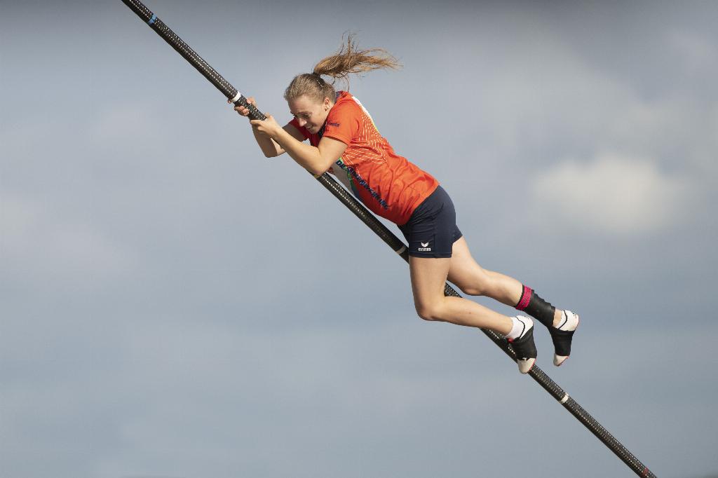 De Benschopse, die deze middag drie keer over de 14meter sprong, deed dat met een keurige afstand van 14.97m. Clubgenote Wendy Helmes uit IJsselstein sprong vijfentwintig centimeter minder en werd met 14.74m tweede, en het brons ging met 14.27m naar de Haastrechtse Kimberly Slootjes.