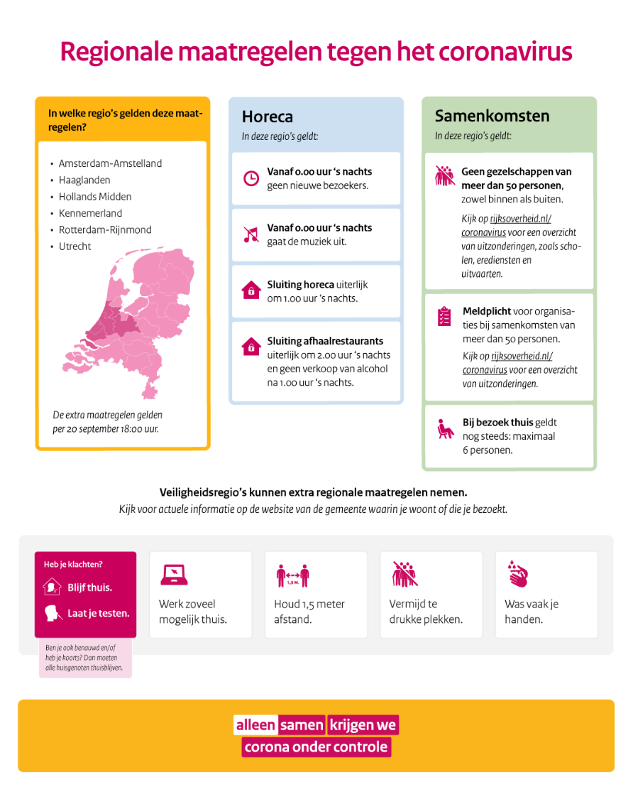 | Binnen de Veiligheidsregio Utrecht neemt het aantal besmettingen nu vooral toe onder mensen tussen de 20 en 39 jaar. De laatste tijd zien we dat met name jongeren van 20 tot 24 het virus dragen. De voorzitter van de Veiligheidsregio, Peter den Oudsten, wil mensen vooral motiveren om zich aan de regels te houden, om deze crisis samen het hoofd te bieden: “De cijfers lopen nu zo snel op dat er iets moet gebeuren om het tij te keren. Het valt op dat vooral bepaalde groepen jongeren zich minder goed aan de coronamaatregelen houden, waardoor het risico dat zij kwetsbare personen besmetten snel toe neemt. Tegelijk zie ik ook hoe moeilijk het is om vol te houden. Zeker als je niet weet hoe lang het nog duurt, je onzeker bent over studie, baan en toekomst en je beperkt wordt in je dagelijkse bewegingsvrijheid. Dit raakt ons allemaal. We gaan met mensen in gesprek om te horen wat zij nodig hebben en wat zij en wij kunnen doen. Maar feit blijft dat we, om te voorkomen dat we straks voor nog lastiger besluiten komen te staan, nu moeten volhouden en onze verantwoordelijkheid nemen. Alleen samen kunnen we verdere verspreiding van het coronavirus voorkomen.” Campagnes en gesprekken met doelgroepen Er komt extra communicatie over de basisregels. Binnen de Veiligheidsregio Utrecht loopt deze maand nog de campagne ‘Hou vol’ en in de stad Utrecht loopt de campagne ‘Thirty030’ #KILLDE2EGOLF. Ook in andere gemeenten in de regio lopen diverse campagnes. Eind deze maand kunnen gemeenten in de Veiligheidsregio de jongerencampagne van het Rijk omzetten in een eigen lokale campagne. Er is speciale aandacht voor groepen waar de meeste besmettingen plaatsvinden. In verschillende plaatsen zijn er gesprekken met vertegenwoordigers van onder meer sport- en ondernemersverenigingen, onderwijsinstellingen en organisaties van studenten en studentenhuisvesting, welzijnsinstellingen, jongerenwerkers, bondgenoten, vertegenwoordigers migrantenorganisaties en branches zoals detailhandel. In de stad Utrecht heeft de burgemeester bijvoorbeeld vandaag afgesproken dat koepels van sport-, studie-, en gezelligheidsverenigingen volgende week zelf met een actieplan komen om de verspreiding terug te dringen. Ook doet de Veiligheidsregio een hernieuwde oproep aan branches, zoals supermarkten, warenhuizen en horecagelegenheden, om vast te houden aan het coronabeleid van afstand houden, schoonmaken en mensen actief te blijven wijzen op naleving. Mogelijkheden venstertijden en extra toezicht en handhaving onderzoeken Naast het blijven motiveren van mensen om de coronaregels in acht te nemen, gaat de Veiligheidsregio de mogelijkheden voor en behoefte aan het instellen van venstertijden in winkels, en overheidsinstellingen zoals bibliotheken en buurtcentra onderzoeken, zodat kwetsbare groepen daar op een rustiger tijdstip naar toe kunnen. Er komt waar mogelijk verscherpte handhaving op naleving van de maatregelen. Zoals het versneld sluiten van instellingen of locaties waar een besmettingshaard is ontstaan. Doel is verdere besmetting zo snel mogelijk in te perken. De Veiligheidsregio zet ook in op aanscherping van toezicht en handhaving in parken, gebieden met een risico op illegale feesten en sectoren waar bovenmatig veel besmettingen plaatsvinden. Extra maatregelen kabinet voor horeca en groepsgrootte Het kabinet heeft besloten dat in de horeca vanaf 24.00 uur de muziek uit en het volle licht aan moet en dat er geen nieuwe mensen meer naar binnen mogen. De zaken moeten om 01.00 uur dicht, dat geldt ook voor terrassen. Verder komt er een verbod op het zich ophouden in een gezelschap van meer dan 50 personen. Het kabinet heeft ook bepaald dat georganiseerde samenkomsten van meer dan 50 personen in publieke ruimte (dus ook binnen, bijvoorbeeld in horecagelegenheden) een meldplicht geldt. De complete tekst over de maatregelen van het kabinet vindt u op Rijksoverheid.nl