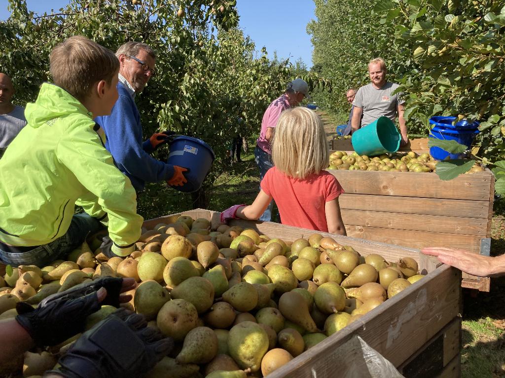 Geplaatst op:25-09-2020 Bijgewerkt op:25-09-2020 07:47 14.000 kilo peren geplukt voor goed doelBron: Rotary Woerden Oude Rijn In september trotseerden cliënten van Brownies&DownieS, Zorg-Los Woerden, de Sleutelbloem Noorden én leden van Rotary Woerden Oude Rijn gedurende een paar weken brandnetels, vervaarlijk zwiepende takken en wespen om zo veel mogelijk peren te plukken. Dat gebeurde op een verlaten perenboomgaard op het Landgoed Linschoten. En dat lukte wonderwel, want er werden 14.000 kilo’s peren geoogst. De cliënten van Brownies&DownieS, Zorg-Los en de Sleutelbloem maakten er bovendien leuke en actieve dagen van in de perenboomgaard. Er werd van alles geleerd. Hoe je een peer plukt natuurlijk, maar ook hoe waardevol de natuur is, die ons voedsel voortbrengt en hoe we kunnen voorkomen dat dat voedsel verspild wordt. Van het grootste deel van het kostbare fruit wordt gepasteuriseerd perensap gemaakt, dat twee jaar houdbaar is en ter beschikking wordt gesteld aan de plaatselijke Voedselbanken. Zo kunnen de cliënten van de Voedselbanken, maar ook de mensen van Brownies&DownieS in hun eigen lunchcafé, er tot in 2022 plezier van hebben. Sociaal-maatschappelijke organisaties als het Inloophuis De Meerpaal en Careyn Weddesteyn in Woerden kregen bovendien een kratje verse peren thuisbezorgd. Ook subsidieverstrekker Rabo Dichtbijfonds werd op peren getrakteerd. Het Perenproject kwam tot stand in samenwerking met de Stichting G. Ribbius Peletier Jr. tot Behoud van het Landgoed Linschoten, Brownies&DownieS Woerden, Zorg-Los Woerden, De Sleutelbloem Noorden en Rotary Club Woerden Oude Rijn, met bijdragen van het Rabo Dichtbijfonds en diverse sponsoren. Voor Rotary Woerden Oude Rijn is dit Perenproject één van de activiteiten die de club ontplooit om als breed georiënteerde netwerkorganisatie van maatschappelijk betrokken professionals een positieve bijdrage te leveren aan de samenleving. Een stralende Philine Vreeken van Brownies&DownieS met een klein stukje van de oogst (foto Dave van der Wolk) De oogst bestond uit kisten vol sappige peren (foto Adriënne Lansbergen)