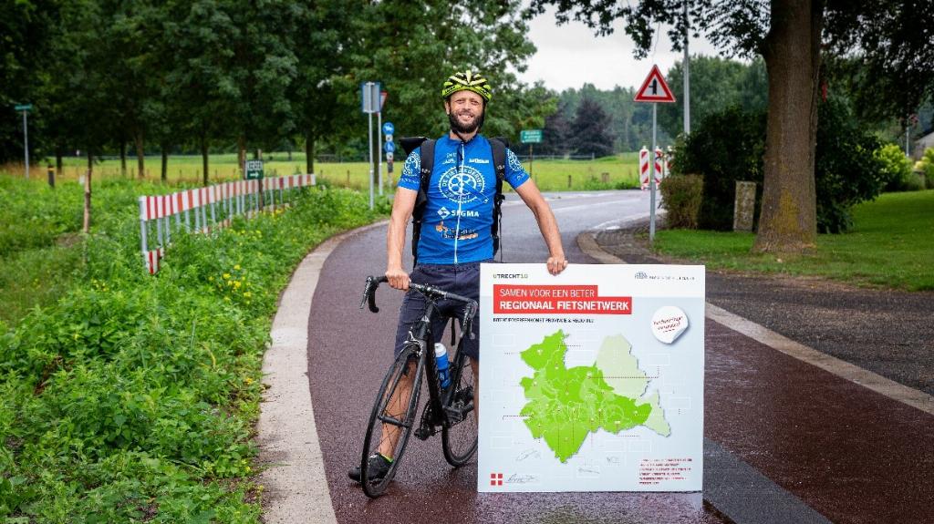Fietskoerier Sjoerd fietst de provincie en gemeenten af om de handtekeningen op te halen. Locatie: Nieuwe fietsstraat Nieuwegein Houten.