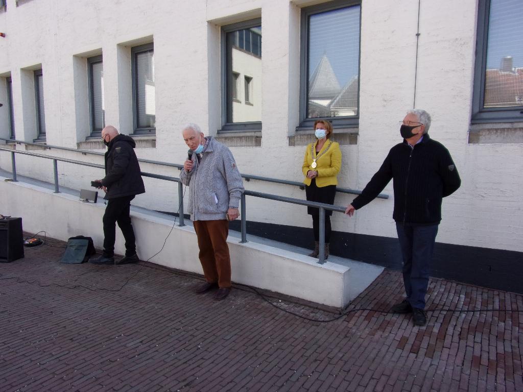 Na de bloemlegging bij het vredesmonument werd gezamenlijk naar het begin van de Vrijheidsspeurtocht bij de RK-kerk gelopen waar de eerste QR-code werd onthuld.