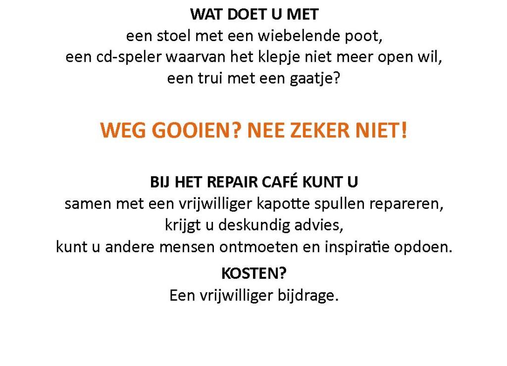 Geplaatst op:26-08-2021 Bijgewerkt op:26-08-2021 13:10 Repair cafe in MontfoortBron: Angel Kraan, SWOMVrijdag 3 september 13:30 uur Montfoort: DoeMeeHuis Montfoort, Kasteelplein 7. Linschoten: SWOM Huis van Ervaring (Brede Vaart), Laan van Rapijnen 36