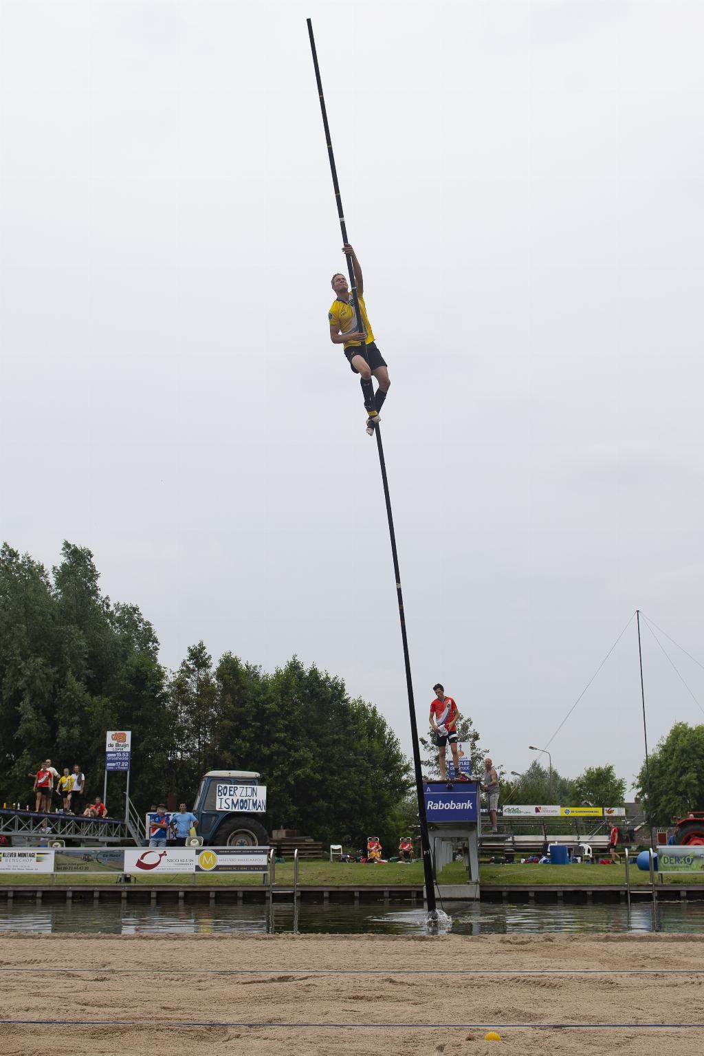Geplaatst op:30-08-2021 Bijgewerkt op:30-08-2021 07:47 Reinier Overbeek de grote man tijdens polsstokverspringen in PolsbroekerdamBron: Media PB HollandAfgelopen zaterdag is er in Polsbroekerdam gesprongen om de Klever Montage Bokaal. De omstandigheden waren voor de springers niet optimaal, doordat de wind met windkracht 4 van rechtsvoren kwam en het slechts 18 graden was. Voor de meeste springers was het de eerste sprong aftasten wat ze met de stok moesten doen om een zo goed mogelijke sprong neer te zetten. Vanwege de wind kan de stok minder ver in het water en menig springer zette de stok iets tegen de wind in om toch recht over te kunnen gaan. Toch maakten de wolken ruimte voor wat zonnestralen en hebben de springers een mooie wedstrijd weten neer te zetten. De senioren leken last van de wind te hebben tijdens de Klever Montage Bokaal. Veel springers kwamen hoog in de stok, maar wisten het niet recht of droog te houden. Het was Daniel Cluistra (Haastrecht) die de wedstrijd hier maakte. In zijn derde sprong bleef zijn stok stilstaan en kon hij naar het topje klimmen. Hij sprong hiermee een prachtig persoonlijk record van 19.79 meter en werd tweede. Ook in de senioren categorie wist ‘een Timmerarends’ een podium plek te bemachtigen. Erwin (Bodegraven) werd derde met zijn afstand van 19.11 meter. De wedstrijd werd in deze categorie gewonnen door Jaco de Groot (Kamerik) met 20.21 meter.  | Bij de dames was er eindelijk weer een volle groep aanwezig tijdens de wedstrijd. Helaas moest thuisfavoriet Fabiënne Overbeek (Benschop) na een misgreep bij de insprong in haar eerste sprong stoppen vanwege een lichte blessure in haar pink. Toch stonden er twee Damse dames in de finale en kleurde het podium voor tweedere blauw. Joriene Baas (Oudewater) sprong een opbouwende wedstrijd en eindigde op de derde plek met een mooie 14.40 meter. Eerstejaars dame Laura Maaijen (Haastrecht) sprong zichzelf onder luid gejuich van haar fans naar een tweede plek met 15.07 meter. De fanatieke Demi Groothedde (Jaarsveld) wist in haar laatste sprong net voorbij Laura te gaan en won de wedstrijd met 15.12 meter. Mark van der Horst (Schoonhoven) heeft in de junioren categorie laten zien dat hij niet vergeten mag worden. Afgelopen winter heeft hij veel looptraining gedaan voor de optimale aanloop naar de stok. Helaas kwam het velen trainen er in het begin van het seizoen niet uit en was het voor hem nog wat zoeken naar zijn vorm. Die lijkt hij nu gevonden te hebben, want met een prachtige 19.06 werd hij tweede tijdens de Klever Montage Bokaal. De winst was natuurlijk voor Reinier Overbeek (Benschop) die met zijn 20.32 meter zelfs de senioren wist te verslaan. Harmen Timmerarends (Montfoort) werd derde met een prima 18.10. In de meisjes categorie wist de alles winnende Suzanne Mulder (Vlist) de wedstrijd te winnen met een prima sprong van 14.39 meter. Een afstand waar ze volgend jaar bij de dames categorie ook mee kan doen aan de top. Thalina van der Wind (Snelrewaard) moest begin dit seizoen nog wat zoeken naar haar vorm, maar lijkt hem nu te pakken te hebben. Met een mooie 13.46 meter is zij op de tweede plek geëindigd. De altijd goedlachse Lieke Stolwijk (Bodegraven) eindigde als derde met 13.01 meter. Bij de jongens sprong was Jonathan Timmerarends (Montfoort) de verrassing van de wedstrijd. De stok leek het perfecte punt te vinden waardoor hij genoeg tijd had om de stok uit te klimmen. Met deze prachtige sprong zette hij een nieuw persoonlijke record neer van 16.95 meter. Helaas voor hem wist de talentvolle Roy Velis (Benschop) wederom de eerste plek over te nemen met een afstand van 17.43 meter. In de finale sprong van Rick Cazant (Kockengen) zat erg veel dreiging om voorbij de afstand van Velis te gaan, maar hij ging helaas te water met die sprong en bleef steken op de derde plek met 15.87 meter. Volgende week zaterdag zullen de beste Hollandse springers te zien zijn in Jaarsveld in de strijd om de Hollandse titel. Het weerbericht ziet er voor goed uit, dus het belooft een mooie wedstrijd te worden.