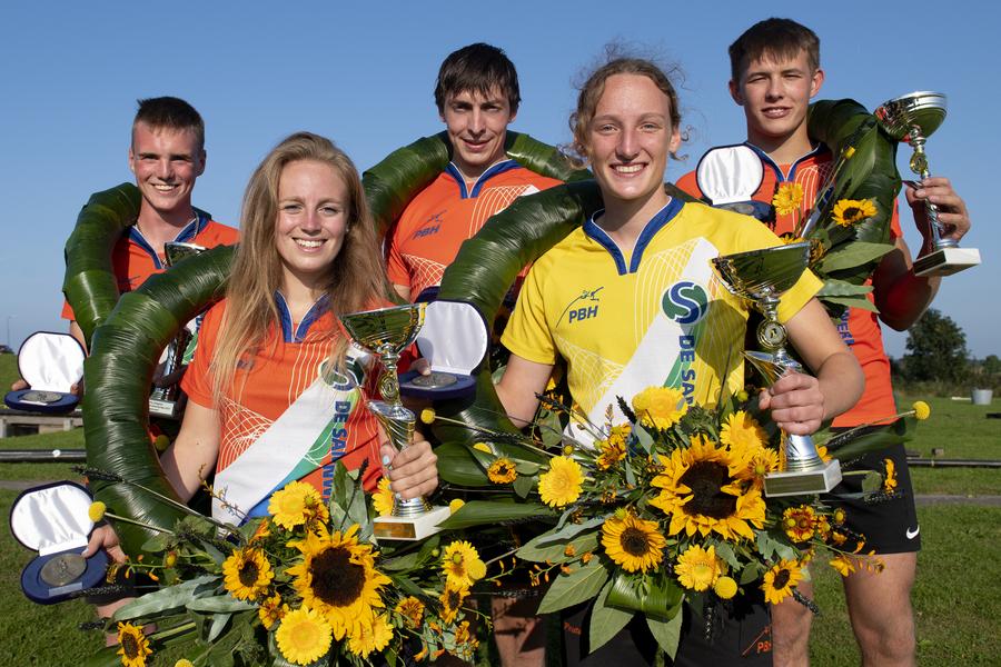 Geplaatst op:06-09-2021 Bijgewerkt op:06-09-2021 19:03 HK Jaarsveld: Spectaculair!Bron: polsstokbondZaterdag 4 september vonden in Jaarsveld onder perfecte omstandigheden de 60ste Hollandse kampioenschappen polsstokverspringen plaats. De 48 beste springers mochten zich in 5 categorieën met elkaar meten, met als inzet de titel Hollands Kampioen en voor de verste sprong in de wedstrijd de Bronzen springer. Springers konden zich kwalificeren via het 'de Samenwerking' puntenklassement waarin de beste 7 wedstrijden van een springer meetellen. De leiders in de diverse categorieën, getooid in een geel shirt, konden ook meteen betiteld worden als favoriet. Senioren ontlopen elkaar niets! Vooraf getipt als de spannendste categorie, bij de senioren waren meer dan 8 springers in staat om te winnen, maakten de heren die status volledig waar! Na een spannende eerste groep senioren waarin de heren dicht bij elkaar bleven qua afstand brak Daniel Cluistra uit Haastrecht de Wedstrijd open met een prima 19.37. Daarna ging het snel met de 19+ sprongen waardoor de top 7 uit het klassement zich snel op een finaleplaats nestelde. Enkel Wijnan van Ingen uit Zegveld kon vanuit de tweede groep meeklappen naar de finale. Klassementsleider Jaco de Groot was de eerste die de 20 metergrens slechtte met 20.14 meter snel gevolgd door Erwin Timmerarends (20.02). In de finale verbeterde eerste Timmerarends zich tot op slechts 3 centimeter van Jaco de Groot waarna de Kameriker zichzelf lucht gaf door te verbeteren naar 20.72 meter. De wedstrijd leek gelopen maar er was buiten Thomas van Midden gerekend die in een ultieme poging tot een geweldige 20.75 meter kwam en zo voor de derde keer in zijn carrière Hollandse kampioen werd, voor de derde keer ook in Jaarsveld. Dames: Soevereine Overbeek Bij de dames werd vooraf een driekamp verwacht tussen Fabiënne Overbeek, Laura Maaijen en klassementsleider Demi Groothedde. Het was echter niet de dag van Laura Maaijen die er niet in slaagde om de finale te houden wat de weg vrijmaakte voor Joriene Baas om zich met de ereplaatsen te bemoeien. Met een afstand van 14.43 meter voldeed zij zeker aan de verwachtingen van kenners én zichzelf, een mooie derde plaats washaar deel. Wat volgde was een strijd tussen de top 2 in het klassement waarbij Fabiënne Overbeek in haar tweede poging een prima afstand van 15.18 sprong. in de volgende rondes deed Demi Groothedde er alles aan om deze voor haar haalbare afstand te verbeteren maar bleef steken op 14.72 meter. Een tweede plaats was haar deel, terwijl de titel naar Fabiënne Overbeek ging. Junioren: Anker verrast Vooraf kon volgens de kenners maar 1 man de junioren titel winnen: Reinier Overbeek. De Nederlands recordhouder, kampioen en klassementsleider was torenhoog favoriet. Chris Anker (Vlist) zette echter in de laatste voorrondesprong een prima 18.62 meter gesprongen, een afstand waar Reinier in zijn laatste voorrondesprong slechts 19 centimeter vanaf bleef. In de finale bleek die 19 centimeter echter onoverkomelijk voor Reinier Overbeek waarna Chris Anker, al zeker van de titel zijn afstand nog verbeterde naar 19.04 centimeter. Zo staat ook de derde klassementsleider 1 stapje lager dan vooraf verwacht. Jongens: Ongelooflijk! In de jongenscategorie schoot Jonathan Timmerarends uit de startblokken met een pr sprong in de eerste ronde van 17.72. Bij de landing raakte hij echter licht geblesseerd waardoor hij niet verder kon in deze wedstrijd. Iets wat de wedstrijd bijzonder zou beïnvloeden. De afstand van Jonathan bleef staan als beste en zou in de finale dus als laatste mogen starten, dat kon echter niet waardoor Joost van weelden als 'Lucky loser' in de finale mocht aantreden. En dat cadeautje pakte hij uit, in de eerste sprong van de finale verbeterde hij zijn pr met bijna 2 meter tot 18.70 meter. Hoewel klassementsleider Roy Velis nog dicht in de buurt kwam met 18.42, bleef voor de man in geel slechts de tweede plaats over en dus weer niet een klassementsleider als winnaar. Meisjes: volgens verwachting In de meisjes categorie gold Suzanne Mulder (Vlist) als torenhoge favoriet voor de titel, en die rol maakte ze volledig waar. In de eerste sprong van de wedstrijd pakte ze de leiding om die niet meer af te staan. Want hoewel Thalina van der Wind (13.14) en Lieke Stolwijk (13.31) prima afstanden lieten noteren konden ze niet tippen aan de 14.49 van Suzanne Mulder. Zo stond Suzanne Mulder als enige klassementsleider op het hoogste treetje tijdens dit HK. Tijdens dit HK hebben de springers van de PBH getoond dat het met de breedte in dit Deel van Nederland wel goed zit, over twee weken kunnen zij toen of de topprestatie ook goed genoeg zijn voor de titels tijdens het NK in Burgum.