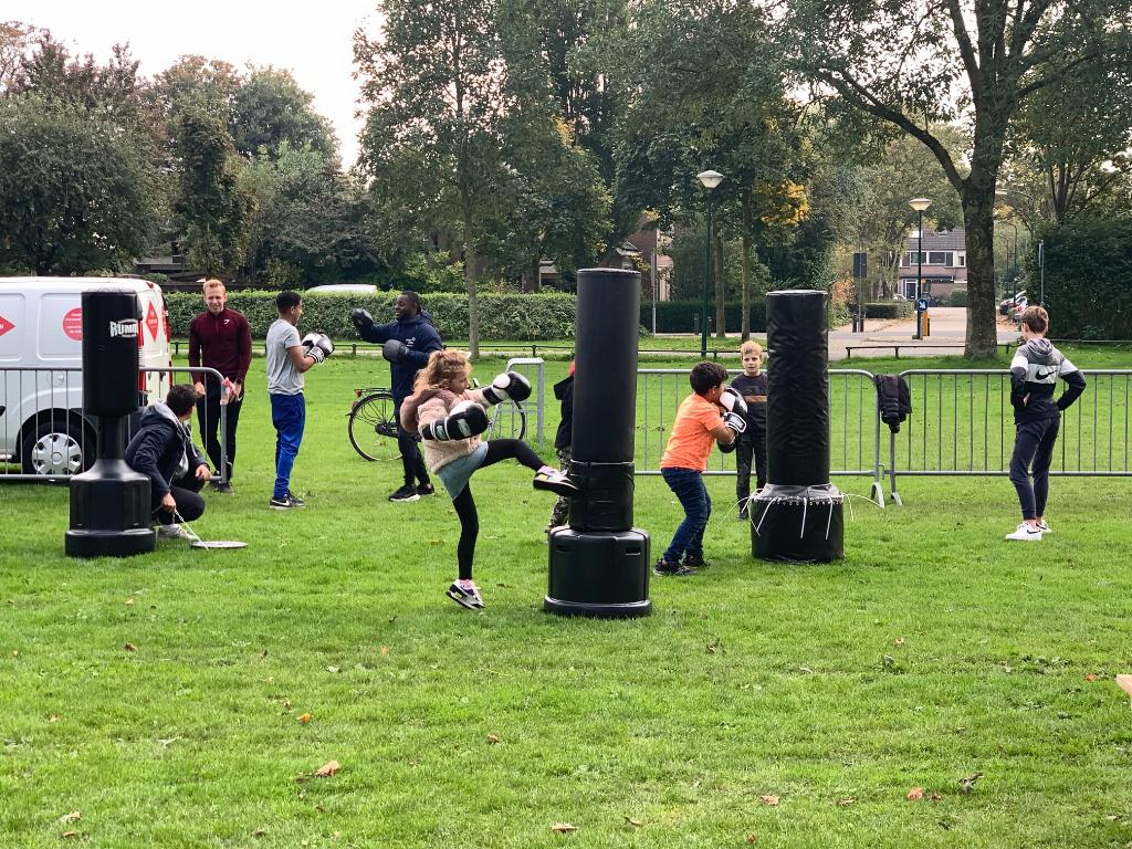 Maandagmiddag werd er werd er een boksclinic georganiseerd in het park. Met zichtbaar plezier sloegen en trapten jongens én meisjes er op los.