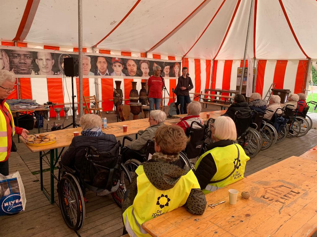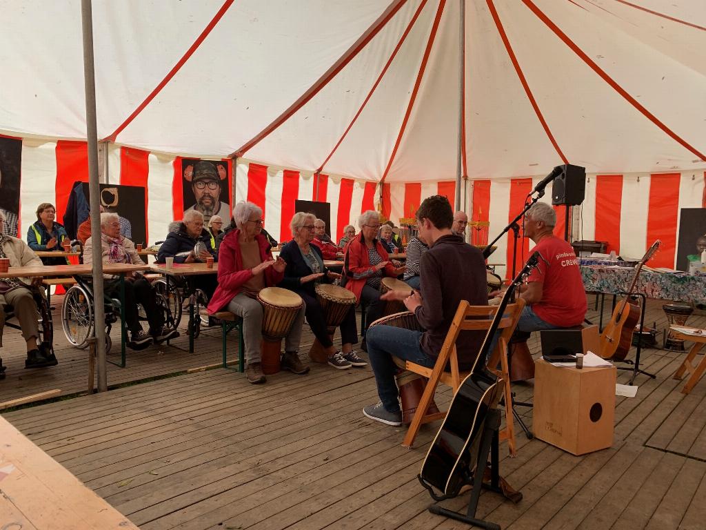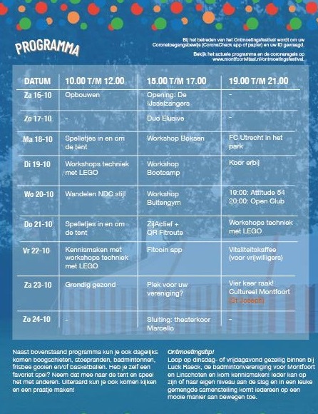 Geplaatst op:21-10-2021 Bijgewerkt op:22-10-2021 07:21 Ontmoetingsfestival MontfoortBron: Nettie Kuijer, foto's John van EchteltIn het Stadspark van Montfoort werden woensdag weer allerlei activiteiten aangeboden. De rolstoelwandelaars van de Zonnebloem werden ontvangen, er kon worden meegezongen met Nico van Asdonck en Martijn Timmerman, Walking footbal gespeeld met ‘FC Utrecht in de wijk‘ en er was een workshop drummen. Donderdagavond is er weer een workshop techniek met Lego Vrijdag 22/10 kan je om 18:00 uur meedoen met ‘Fit de wintertijd in! van VitalDays! In drie kwartier train je heel het lichaam op het gebied van kracht en conditie. Vrijdag 22/10 komt ZWUP een muzikaal intermezzo verzorgen tijdens het Vitaliteitskaffee (aanvang 19:00 uur). za 23/10 speelt Henk Berkheij om 15:00 uur country folk muziek gegoten in een eigen jasje. Als je naar Henk luistert, ga je vanzelf meezingen. Bij het betreden van het terrein zal om een corona toegangsbewijs (Corona Check app of papieren versie) en uw ID worden gevraagd.