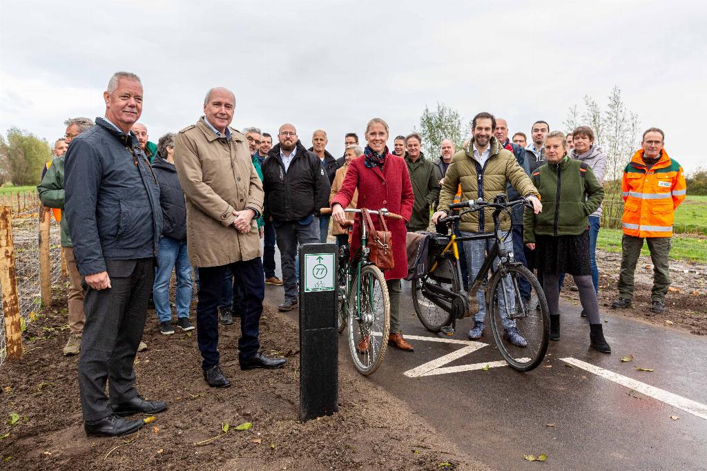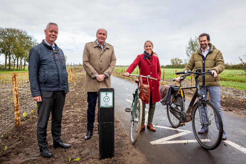 Geplaatst op:08-11-2021 Bijgewerkt op:08-11-2021 13:25 Nieuw recreatief fietspad verbindt IJsselstein en UtrechtBron: Marc Bosboom, fotografie: Rick Huisinga.‘Verlengde Meerlopad’ krijgt in 2022 definitieve naam Het fietspadennetwerk in de provincie Utrecht is uitgebreid met een nieuw fietspad tussen de Noord-IJsseldijk en de Nedereindseweg, tussen IJsselstein en Utrecht. Wethouders Kees Geldof van gemeente IJsselstein en Lot van Hooijdonk van gemeente Utrecht opende samen met gedeputeerde Arne Schaddelee van provincie Utrecht en voorzitter Johan van Everdingen van recreatieschap Stichtse Groenlanden afgelopen maandag 8 november dit nieuwe fietspad. Het draagt nu nog de werknaam ‘Verlengde Meerlopad’, maar begin 2022 buigt de IJsselsteinse straatnamencommissie zich over een definitieve naam, die linkt naar de rijke historie van dit gebied. Met het bevestigen van fietsknoopuntbord nummer 77 werd het fietspad officieel in gebruik genomen en toegevoegd aan het provinciale fietsknooppuntennetwerk. Het geheel is uitgevoerd in opdracht van recreatieschap Stichtse Groenlanden, door Recreatie Midden-Nederland en aannemersbedrijf Mouwrik uit Waardenburg en in samenwerking met gemeenten IJsselstein en Utrecht, provincie Utrecht en Staatsbosbeheer. Ook aan de natuur is gedacht, want de oevers van de watergang langs het fietspad zijn als onderdeel van het project natuurvriendelijk ingericht. Verder heeft de gemeente IJsselstein een aanpassing aan de Noord-IJsseldijk uitgevoerd om de veiligheid van de fietser te verhogen. Het nieuwe kruispunt dat ontstaan is bevindt zich vlakbij een bocht in de weg. Daarom is het kruispunt als een 30km/u zone uitgevoerd. Rondom het nieuwe kruispunt is zo’n 50 meter aan rood-asfalt aangelegd met een middenstrook. Aan weerszijde is een verkeersdrempel geplaatst, bestemd voor 30km/u. Groen groeit mee Het ‘Verlengde Meerlopad’ is onderdeel van het in 2020 afgeronde Programma Recreatie om de Stad (RodS) van de provincie Utrecht en is één van de laatste projecten uit dit programma. Onder dit programma zijn verschillende groengebieden en recreatieve verbindingen in provincie Utrecht gerealiseerd, ondanks dat in 2011 de bijdrage vanuit het Rijk stopte. Aan deze samenwerking willen provincie en gemeenten graag een vervolg geven, zodat de groei van de regio hand in hand gaat met vergroening en kwaliteitsverbetering ten behoeve van mens en natuur. In het visiedocument ‘Integraal ruimtelijk perspectief’ hebben de 16 Utrechtse gemeenten samen met de provincie vastgelegd dat ‘groen’ meegroeit met de stedelijke ontwikkeling in de regio. De ontwikkeling van stedelijk gebied, stadsranden en landelijk gebied zijn erop gericht om de groene kwaliteiten van de regio te versterken en te behouden. Deze groene en landschappelijke kwaliteiten zijn de basis van de kwaliteit van de regio voor ieder gemeente in de provincie. Deze groene ambities zijn vertaald in het programma ‘Groen Groeit Mee’, waarin gemeenten samen met de provincie Utrecht concrete plannen uitwerken om de ambities te realiseren. Daarbij wordt aan het Rijk gevraagd om weer mee te investeren in groen dat de stedelijke ontwikkeling mogelijk maakt en ondersteunt. De opening van het nieuwe fietspad maakt duidelijk dat met een goede samenwerking waarin partners gelijkwaardig optrekken er mooie producten zoals dit fietspad gerealiseerd kunnen worden. Op de foto, van links naar rechts: Johan van Everdingen, Kees Geldof, Lot van Hooijdonk, Arne Schaddelee.