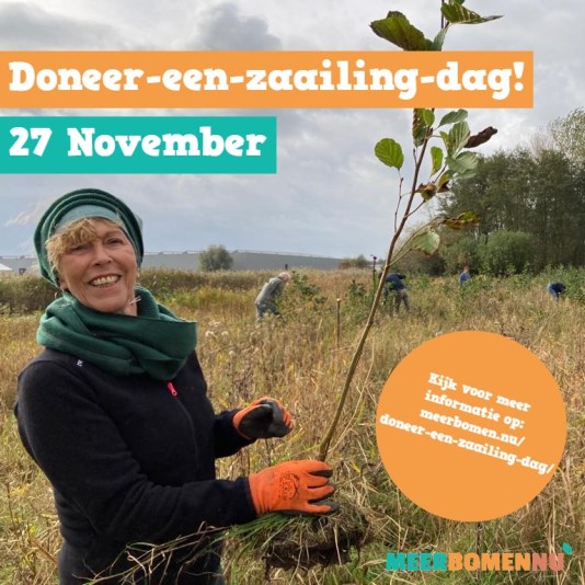 Op zaterdag 27 november organiseert Meer Bomen Nu een landelijke doneer-een-zaailing-dag voor klimaat en biodiversiteit. Alle Nederlanders worden opgeroepen om de tuin in te duiken en zaailingen, stekken en slieten te verzamelen en in te leveren bij één van de 200 inleverpunten in het hele land.  In bijna iedere tuin is wel een jonge boom of struik te vinden die daar niet kan overleven omdat ze te weinig licht krijgen of omdat ze ongewenst zijn. 1100 boeren en burgers die samen één miljoen bomen en struiken willen planten, zorgen dat jouw zaailing de kans krijgt om volwassen boom te worden langs een boerenakker, op een industrieterreinen, een achtertuin of in een nieuw voedselbos.