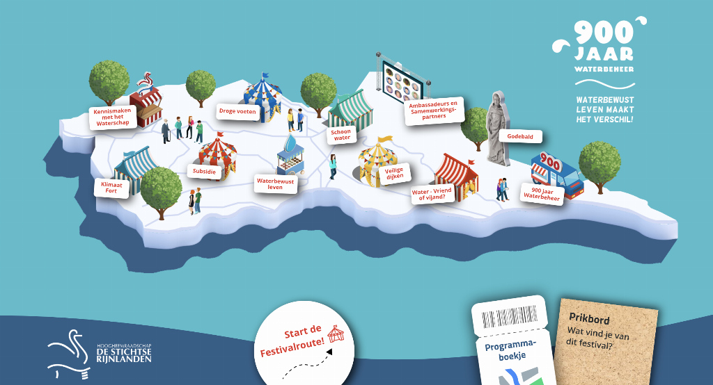 Waterbeheer, waterbewust leven en de Stichtse waterschapsregio krijgen in 2022 een vernieuwend en inspirerend podium. Hoogheemraadschap De Stichtse Rijnlanden viert 900 jaar Waterbeheer en opent daarom een interactief online festivalterrein. Een uniek kijkje achter de schermen van het werk van het waterschap. Je ontdekt hoe waterbeheer in de regio Utrecht is ontstaan, wat het waterschap zoal doet en hoe je zelf ook waterbewust kunt leven!
