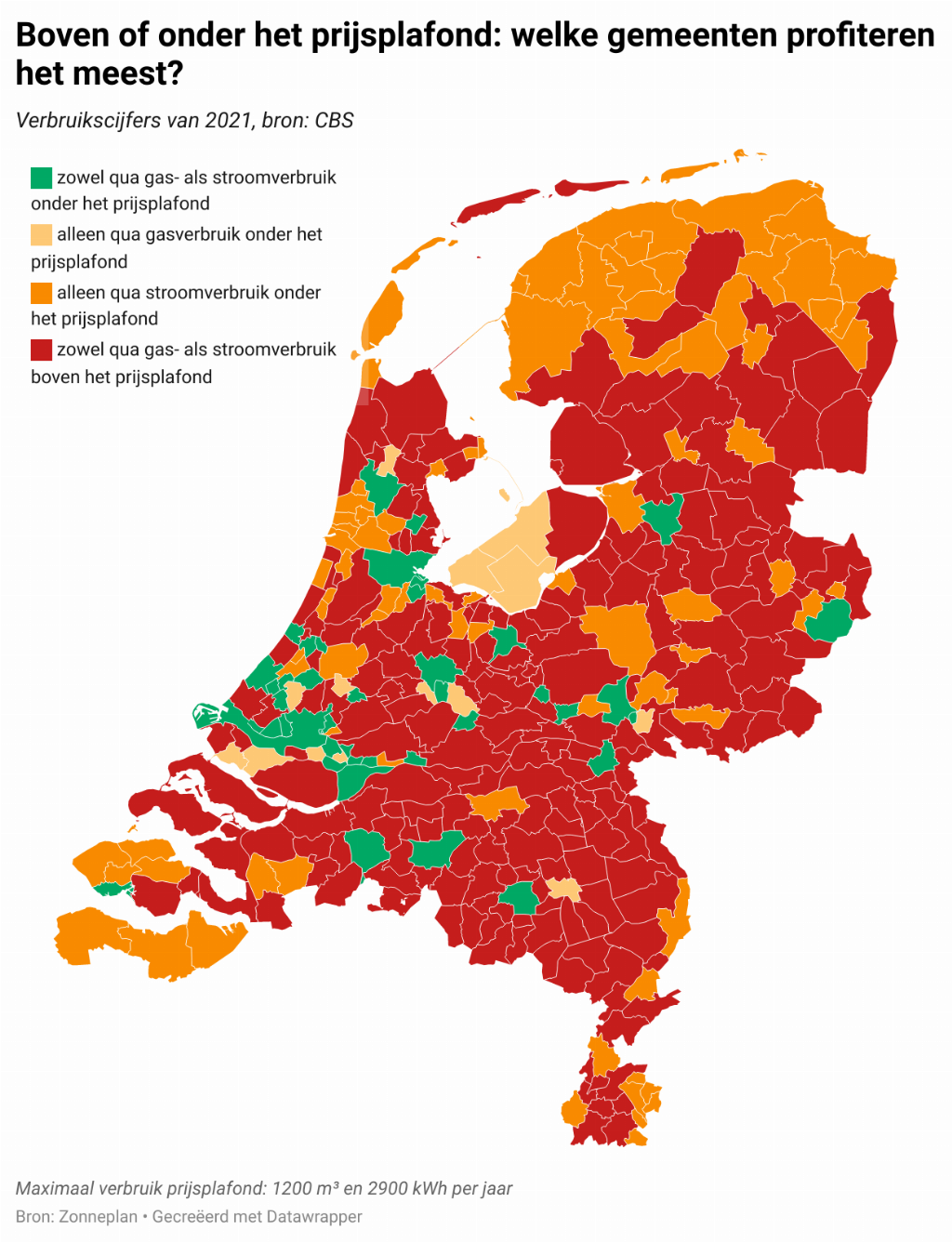 Onder het stroomplafond Opvallend is verder dat in vrijwel alle gemeentes ook het stroomverbruik boven de limiet van 2900 kWh per jaar ligt. Landelijk valt op dat gemeenten nog wel regelmatig onder het stroomplafond blijven. Dat geldt in de provincie Utrecht alleen voor de gemeenten Baarn, Nieuwegein, Veenendaal, Utrecht en Amersfoort. Voor de laatste vier geldt dat ook het gasverbruik gemiddeld genomen onder de 1200 kuub blijft. Verschillen met landelijke gemiddelden Landelijk gezien ligt in zes op de tien gemeenten het gemiddelde gas- en stroomverbruik boven het verbruiksplafond dat het kabinet per 1 januari instelt. In slechts één op de negen gemeenten blijft een doorsnee huishouden binnen de grenzen van zowel 2900 kWh stroom als 1200 m³ gas per jaar. Op de kaart is te zien hoe de Utrechtse gemeenten zich verhouden ten opzichte van de rest van Nederland. Vaste prijs binnen verbruiksplafond Het is voor veel Utrechtse huishoudens de komende periode zaak veel energie te besparen. Het prijsplafond, waardoor je niet meer dan 1,45 euro per kuub gas en 0,40 euro per kilowattuur stroom betaalt, ongeacht je energiecontract, geldt namelijk tot een verbruik van 1200 kuub en 2900 kilowattuur. Voor het verbruik boven die waardes betaal je wel de - vaak hoge - prijzen uit je energiecontract. Volgens Zonneplan wordt inzicht in het energieverbruik het komende jaar dan ook belangrijker dan ooit.