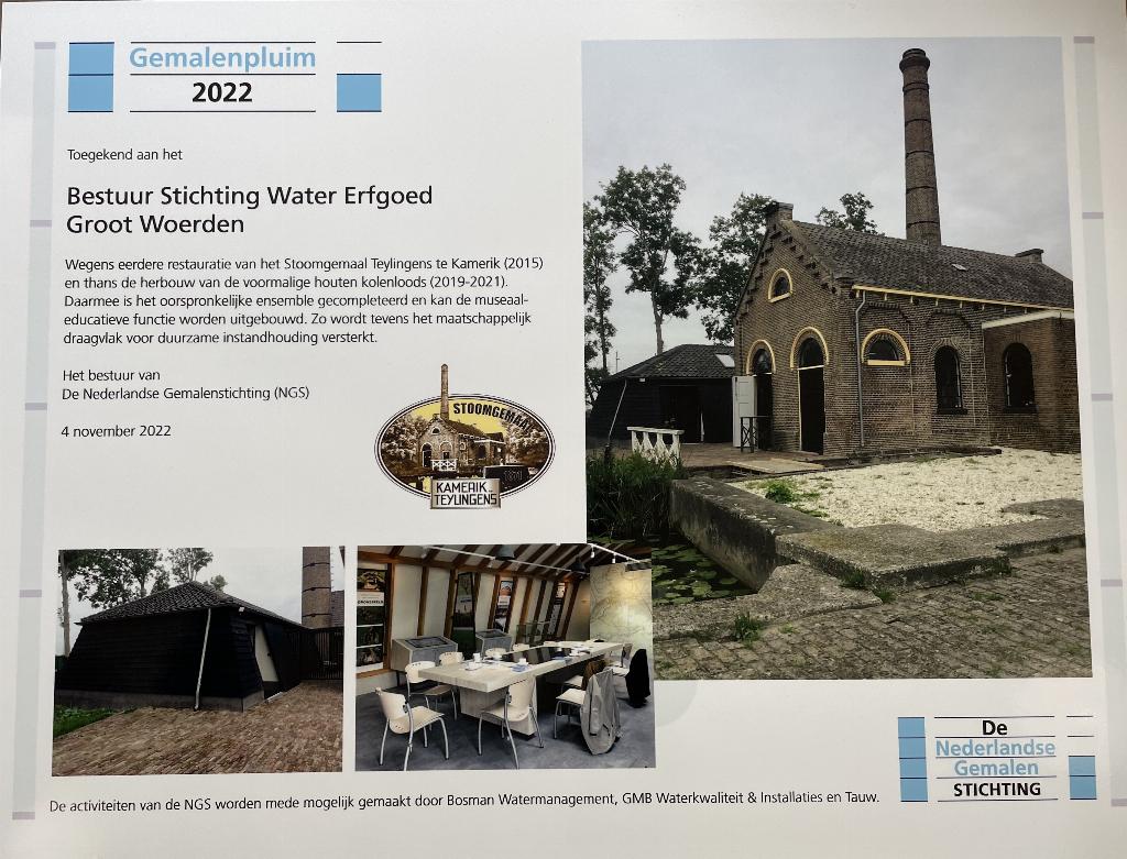 De stichting Watererfgoed Groot Woerden die het gemaal in beheer heeft van het Hoogheemraadschap Stichtse Rijnlanden (HDSR) is trots dat ze namens alle vrijwilligers die bij het gemaal betrokken zijn de Pluim in ontvangst mocht nemen.