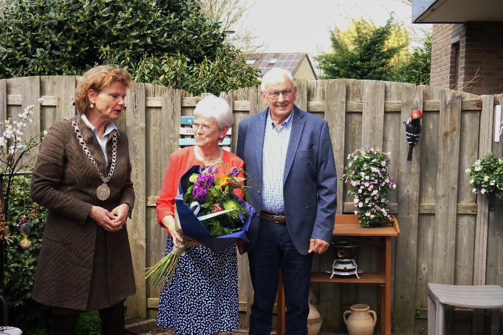 Bezoek burgemeester Vanwege de feestelijke gebeurtenis bezoekt burgemeester Petra van Hartskamp het diamanten echtpaar. Ook de plaatselijke en regionale pers is aanwezig. Onder het genot van een kop koffie met wat lekkers erbij wordt gezellig gepraat en worden herinneringen en verhalen opgehaald. Burgemeester Van Hartskamp overhandigt het echtpaar een mooie bos bloemen. Speciaal voor de foto in hun mooie tuin trekt Theo een passend jasje aan.
