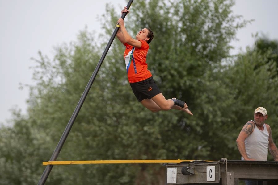 Geplaatst op:19-06-2023 Bijgewerkt op:19-06-2023 08:24 Polsstokverspringen in Jaarsveld, 17 juni 2023Bron: Polsstokbond HollandWedstrijdverslag RB Traprenovatie Bokaal - 17-06-2023 Formidabele sprongen in Jaarsveld. Onder prima weersomstandigheden werd zaterdag met de polsstok gesprongen om de RB Traprenovatie Bokaal. Dames De spannendste strijd werd gestreden in de damesklasse. Joriene Baas (Oudewater) zette direct de wedstrijd op scherp door in haar 1e poging haar persoonlijk record te verbeteren en te brengen op 15.93 meter. Tessa Kramer (Amersfoort) mocht voor het eerst in het gele klassementsleidershirt springen na haar winst van afgelopen woensdag in Polsbroekerdam. In haar tweede poging nam ze de wedstrijd over door 16.04 meter op de borden te noteren. Plaatselijk favoriet Demi Groothedde (Jaarsveld, foto) was minder succesvol in haar eerste pogingen, maar wist uiteindelijk in haar 3e poging tot 16.23 meter te komen en zo de bokaal op haar naam te schrijven.