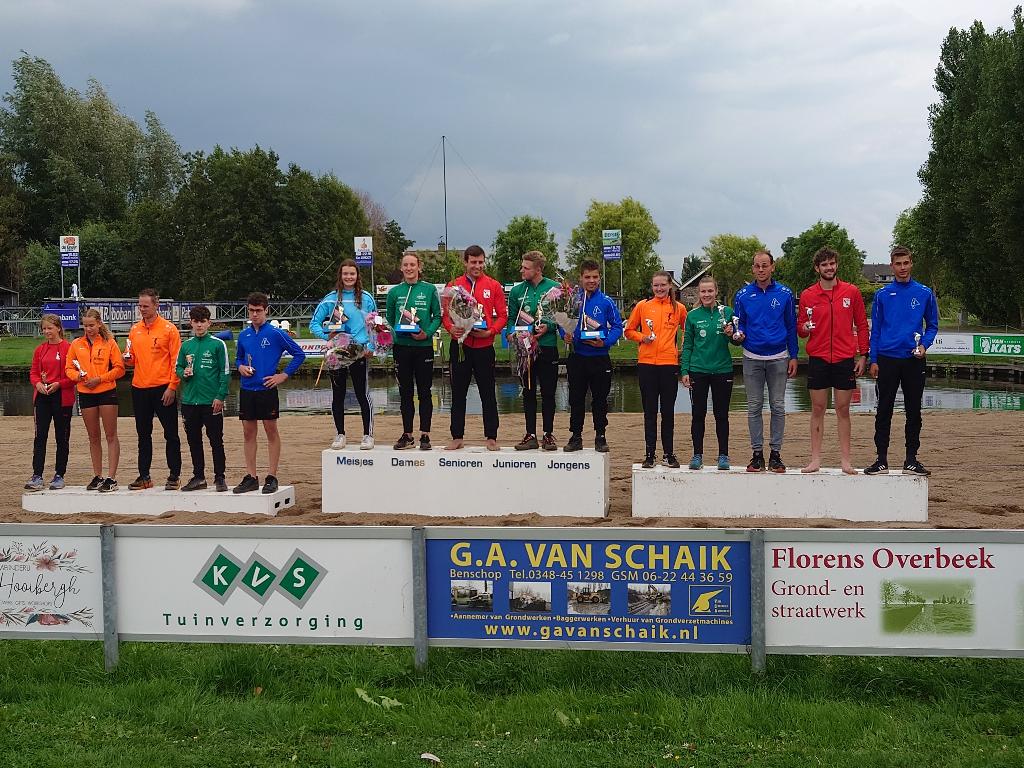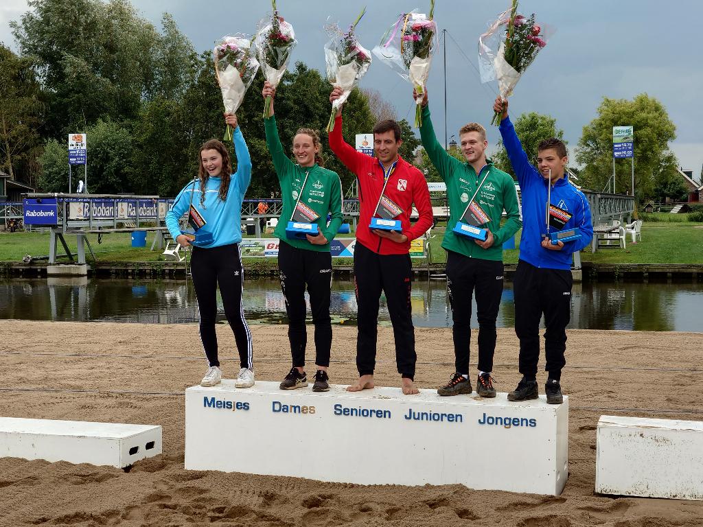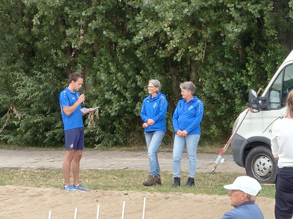 Geplaatst op:24-07-2023 Bijgewerkt op:24-07-2023 09:05 Polsstokverspringen Polsbroekerdam 22 juli 2023Bron: Ronald Vlasveld, Polsstokbond HollandOp de wedstrijdlijst van de Klever Montage Bokaal stonden de namen van slechts 27 springers. Onder bewolkte omstandigheden en soms een spatje regen wisten zij er echter een zeer aantrekkelijke wedstrijd van te maken. Senioren Bij de senioren was het tot het laatste moment spannend. Erwin Timmerarends (Bodegraven) had in de voorronde al een afstand neergezet van 21.24m. Deze werd in de finale door Rian Baas (Utrecht) geëvenaard, maar in de laatste sprong wist Timmerarends zijn afstand nog te vergroten tot 21.45m. Daarmee vestigde hij een nieuw kampioenschapsrecord voor de Klever Montage Bokaal. Baas is na een vertraagde seizoensstart goed op weg naar zijn niveau van vorig jaar door vandaag twee keer zijn seizoensrecord te verbeteren (20.07m en 21.24m). Jaco de Groot (Kamerik) wist in de finale met 19.73m de derde plaats vast te houden. Dames Bij de dames ontbrak de leidster in het ABZ De Samenwerking klassement, Tessa Kramer (Amersfoort). Dat maakte het voor andere springsters makkelijker om te gaan voor de eerste plaats. Suzanne Mulder (Vlist) wist al in de tweede sprong de wedstrijd naar zich toe te trekken. Met een prima 15.08m was ze iedereen de baas en kon de bokaal in ontvangst nemen. Het podium werd gecompleteerd door Julia van Eijk (Haastrecht) en Lieke Stolwijk (Bodegraven). Junioren De Junioren maakten het in de finale spannend. De wedstrijd werd gewonnen door Mark van der Horst (Schoonhoven). Hij wist met een beste seizoensprestatie van 20.08m klassementsleider Hidde van Dam (Montfoort) te passeren. Van Dam slaagde er, ondanks zijn inzet, niet in zijn afstand van 18.30m uit de voorrondes te verbeteren. De derde plaats was voor Wessel Schenk (Schoonhoven). Jongens Bij de jongens was de strijd ook spannend tot in de finale. Gerwin de Jong (Polsbroek) wist zich in zijn laatste sprong met een nieuw persoonlijk record van 17.67m als nieuwe leider in de wedstrijd te manifesteren, maar dorpsgenoot Harmen Bogaard wist er in zijn laatste sprong nog een 17.74m uit te persen, waarmee hij de Bokaal veroverde. De derde plaats was hier voor Jelle de Ruijter (Oudewater). Meisjes Ook bij de meisjes was er een verrassende winnares: Nikita van Dijk (Kamerik) sprong in de finale een persoonlijk record van 14.72m. Daarmee troefde zij klassementsleidster Gemma van Oosterom (Woerdense Verlaat) af. De derde podiumplek was voor Esther Wesselink (Montfoort). Lid van Verdienste In de pauze voor de finale werden door het bestuur van de afdeling Polsbroekerdam twee bekende leden geëerd voor hun bijdrage aan de vereniging: Anja Baas en Jolanda Maton, beide oud-bestuursleden en tegenwoordig zeer actief in de cateringwagen op het wedstrijdterrein, werden benoemd tot Lid van Verdienste.