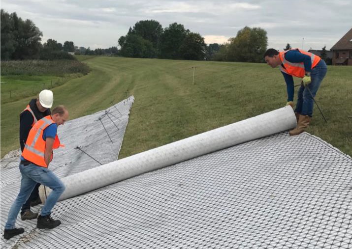 folie werkt als een soort graslaag die de dijk beschermt. Deze noodmatregel is bedoeld om plekken waar tijdelijk weinig of geen gras aanwezig is, te versterken. Medewerkers van het waterschap trainen het vastmaken van de ‘folie’ aan de dijk.