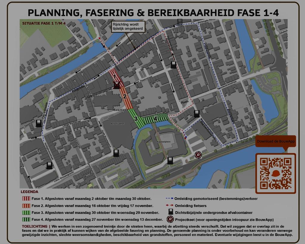 Veiligheid en bereikbaarheid staan centraal tijdens de uitvoering van de werkzaamheden. In de verschillende fases sluit Roelofs delen van de straat, waar de werkzaamheden plaatsvinden, af. Hierbij is er altijd een omleidingsroute beschikbaar voor auto- en fietsverkeer. Deze wordt tijdig met borden aangegeven. Onderdeel van een omleidingsroute is dat de rijrichting in de Hoogstraat, tussen de IJsselpoort en Havenstraat, van 2 oktober tot ongeveer eind december omgedraaid wordt. Hieronder ziet u een afbeelding met de planning, fasering en bereikbaarheid van fase 1 tot en met 4.
