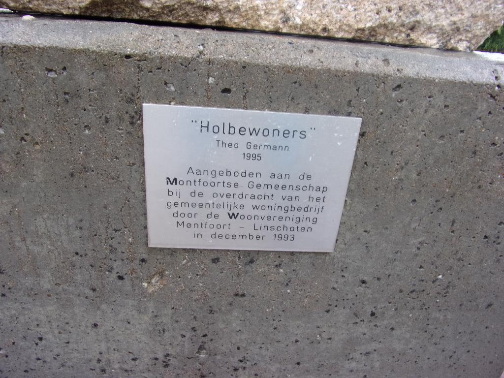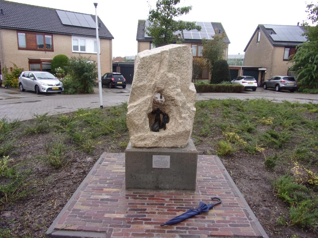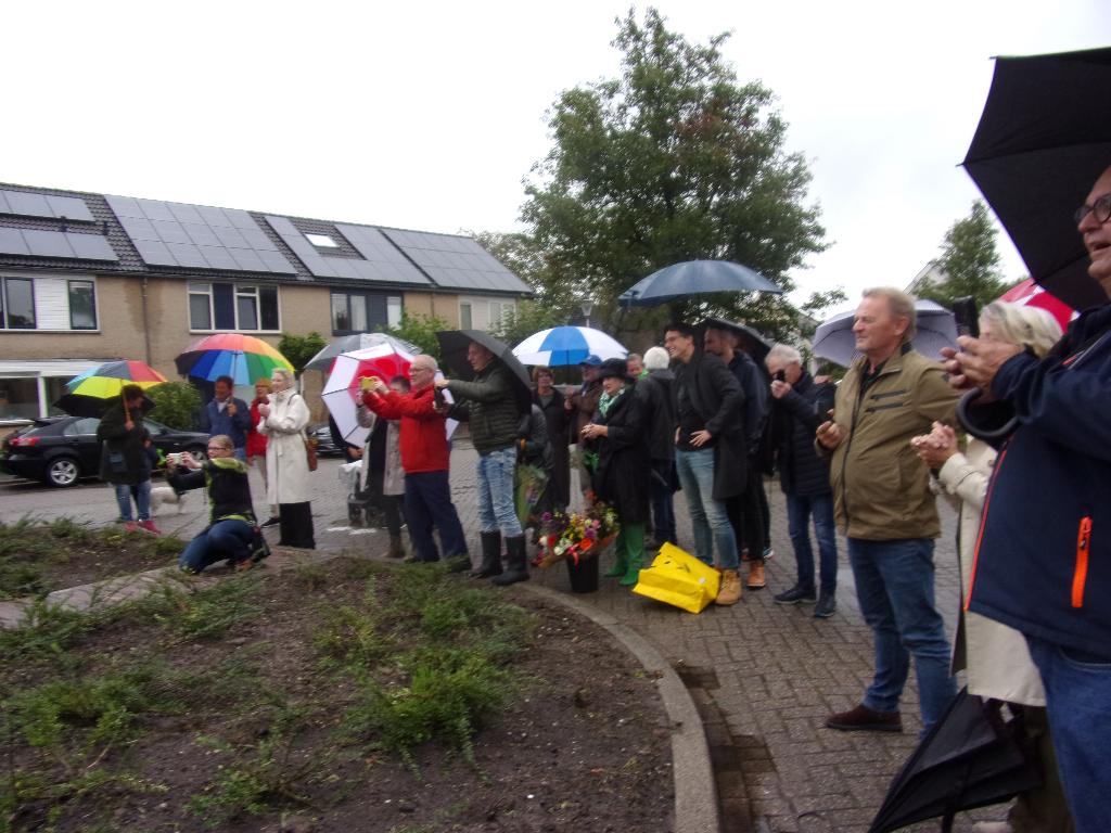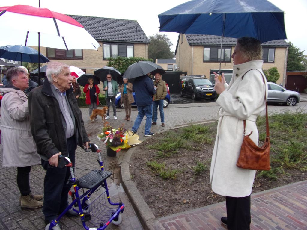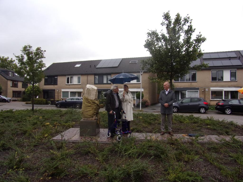 Geplaatst op:12-10-2023 Bijgewerkt op:12-10-2023 16:15 Beeld De Holbewoners op de nieuwe locatie Hofdijk.Bron: Nettie Kuijer, redactie Radio Stad MontfoortDonderdag 12 oktober, terwijl de regen even de adem inhield, werd kunstwerk “De Holbewoners” onthuld door de heer Theo Germann en wethouder Kees van Dalen. Dat er zoveel mensen het barre weer hadden getrotseerd vond de kunstenaar geweldig. “Ook in de oertijd was het vaak slecht weer, maar de mensen waren het gewend. Ze kropen door de struiken en bij bar weer, zo stel ik me voor, schuilden ze in een grot.” Al 33 jaar geleden had hij het kunstwerk ontworpen en hij vond het een eer dat hij op de leeftijd van 96 jaar het beeld op deze nieuwe locatie in Montfoort welkom mocht heten.