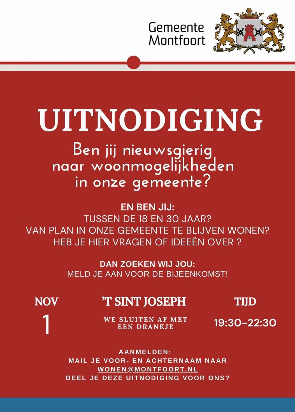 Geplaatst op:30-10-2023 Bijgewerkt op:30-10-2023 10:03 Woonavond voor jongeren tussen 18 en 30 jaar op 1 novemberBron: Gemeente Montfoort Kom jij ook langs in St. Joseph op 1 november van 19:30 tot 22:30? De woningnood is groot; zeker ook voor starters op de woningmarkt. Ken jij of ben jij een jongere tussen de 18 en 30 jaar die moeite heeft met het vinden van een betaalbare en geschikte plek om te wonen in onze gemeente? Sta je (of hij of zij ingeschreven, maar vist steeds achter het net? Dan is deze woonavond het moment om mee te praten over woonmogelijkheden, flexwonen en wat er belangrijk is in de wijk. Welke woningbouwprojecten zijn er in de gemeente? Wat is flexwonen? Wat vinden jongeren belangrijk voor hun leefomgeving, mobiliteit en vrije tijd? Hoe werkt het als jongeren een woning willen huren of kopen en welke ideeën hebben zij zelf om de woningnood tegen te gaan? Daarover gaan we graag in gesprek met de jongeren uit Montfoort en Linschoten. Programma Dus kent u een jongere tussen de 18 en 30 jaar die op zoek is naar een woning/woonruimte in onze gemeente? Dan komen wij graag met hem/haar in gesprek. Burgemeester Petra van Hartskamp is bij de avond aanwezig, net als de gemeentelijke projectleiders. Zij vertellen over woningbouwprojecten in Montfoort en Linschoten. Woonstichting Cazas vertelt over haar werkwijze, hoe toewijzing werkt en over (flex)woningprojecten. Aanmelden Aanmelden kan via wonen@montfoort.nl.