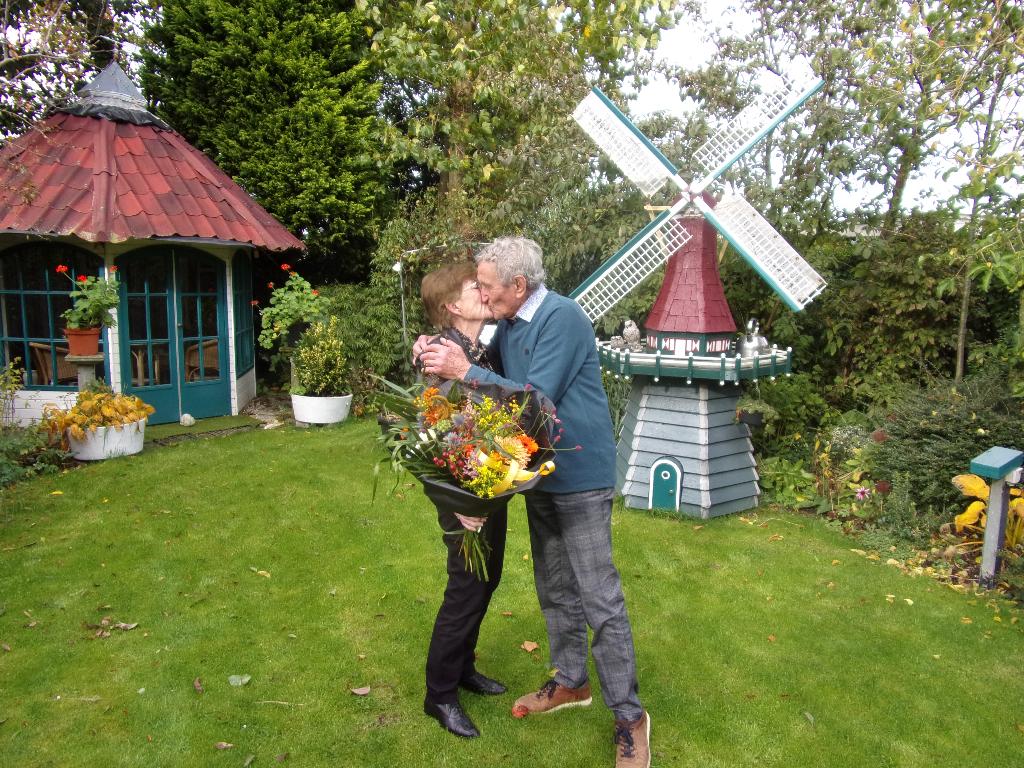 Tijdens de strenge winter van 62-63 maakte Gert alle kozijnen en ramen. Het noorden noteerde in januari 25 ijsdagen en op 18 januari daalde de temperatuur in Joure tot min 21 graden en juist die dag werd de Elfstedentocht gereden. In maart, na de vorst, begon hij met de bouw van hun huis. Gert en Riet gaven hun huis de naam: “Na Vijven,” want het werd na werktijd (toen nog 48 uur per week) gebouwd.   | | Riet naaide zelf haar trouwjurk en het stel trok in de mooie woning, Echter, tot grote woede van Riet werd ze ontslagen bij de bank in Woerden bij haar trouwen. Heel normaal in die jaren. “Daar zat ik, we hadden het geld goed kunnen gebruiken.” Met de komst van de kinderen kwam er weer genoeg werk op haar pad, en later vond ze gelukkig weer een fijne administratieve baan.  | Nog steeds wonen Riet en Gert met plezier in hun huis met prachtige tuin waar ze niet alleen van genieten maar ook zelf alle werk verrichten. Creatief als Gert is heeft hij allerlei leuke elementen in de tuin gemaakt, maar ook voor de kinderboerderij. Stilzitten is er niet bij, Riet en Gert sporten dagelijks. Er wordt gewandeld en gefietst. Dagelijks zet Riet een gezonde maaltijd op tafel van verse groente, en weinig zout en vet.