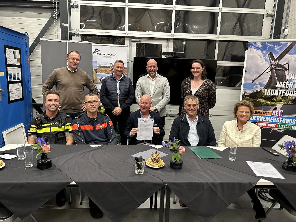 Geplaatst op:03-11-2023 Bijgewerkt op:03-11-2023 12:49 Ondertekening Intentieverklaring Veilig Ondernemen/Green DealBron: Ad Huizer, redactie Radio Stad Montfoort Donderdag 2 november is een belangrijk moment voor veel partijen in Montfoort. De intentieverklaring “Samen Veilig Ondernemen” wordt ondertekend door Bedrijvenvereniging Montfoort, Veiligheidsregio Utrecht, Politie eenheid Midden-Nederland, Platform Veilig Ondernemen Midden-Nederland en Gemeente Montfoort. Deze partijen slaan de handen ineen om de veiligheid van personen en eigendommen op de bedrijventerreinen Linschoten en Montfoort te verbeteren! Green Deal Daarnaast is De Green Deal in gemeente Montfoort een feit. De ondernemers van alle bedrijvenverenigingen uit onze gemeentez etten in aanwezigheid van gedeputeerde de heer A. van Schie gezamenlijk de handtekening onder de Green Deal. Montfoort is hiermee de eerste gemeente in de provincie Utrecht! Met de Green Deal is een grote stap gezet in de verduurzaming van de bedrijventerreinen. Met de Green Deal wordt gestimuleerd de samenwerking op klimaatprojecten op te zetten en uit te voeren. Locatie Verhart Groen BV is de gastheer De pers is ook uitgenodigd om de ondertekeningen bij de wonen en te voorzien van foto's! In storm en regen kreeg uw verslaggever het voor elkaar om bij de verkeerde deur aan te kloppen, waardoor de 1e ondertekening net werd gemist! Ondertekening intentieverklaring “Samen Veilig Ondernemen” Onderstaande foto toont de ondertekening van de intentieverklaring "Samen Veilig Ondersteunen" weer. Lenie Pol, dank je wel voor de foto!