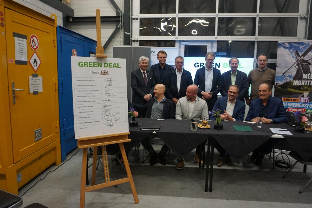 Ondertekening Green Deal Na wat inleidende woorden over de Green Deal is het al snel tijd voor het zetten van de handtekeningen. Alle belanghebbenden tekenen met een zwarte stift op het bord "Green Deal. Montfoort heeft met deze Green Deal de primeur, een extra feestelijk moment!