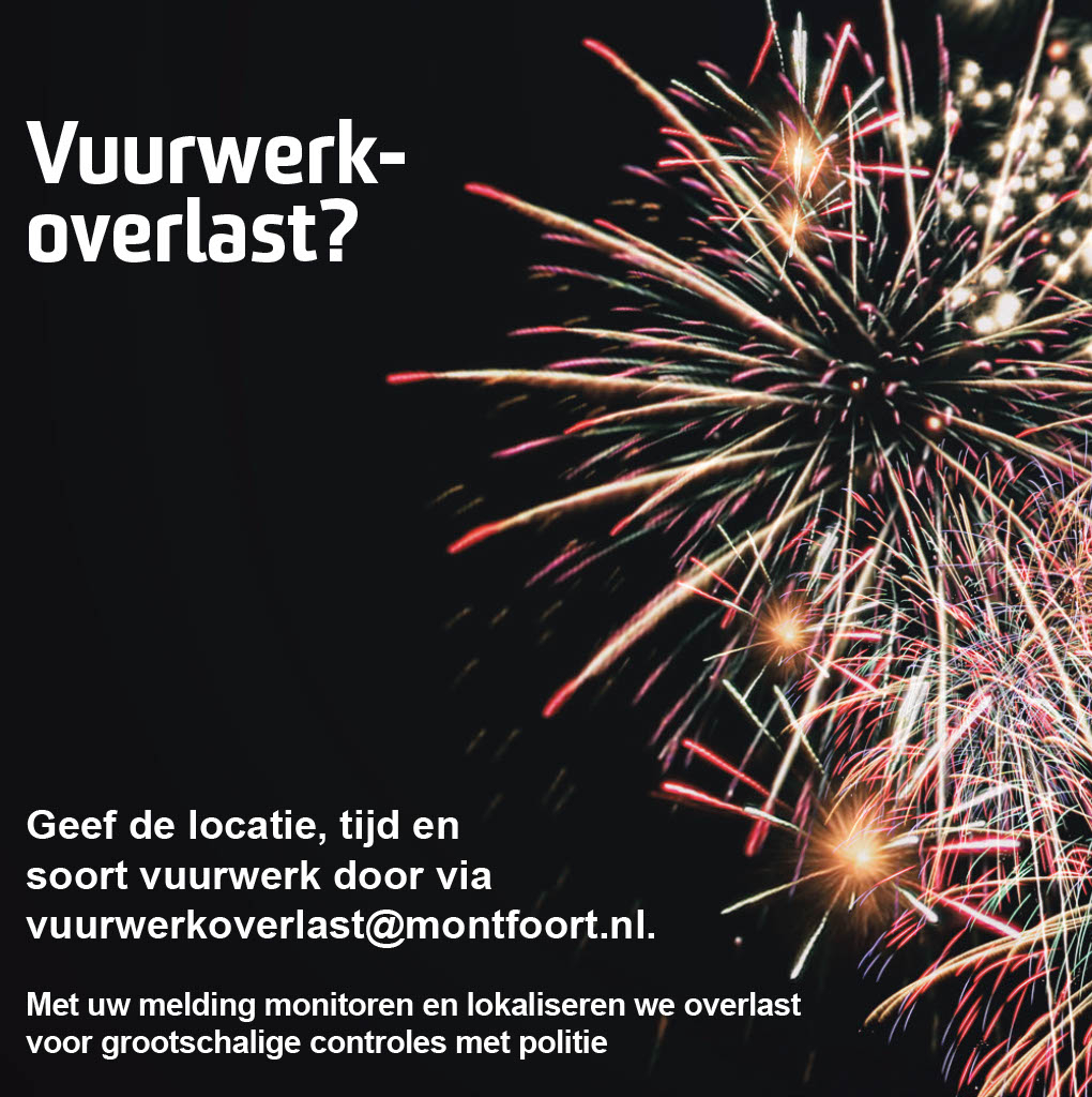 Geplaatst op:28-12-2023 Bijgewerkt op:28-12-2023 10:38 Veilige jaarwisselingBron: Gemeente Montfoort Vuurwerk kleurt oudjaarsnacht en de knallen laten ons weten dat het nieuwe jaar is begonnen. Helaas gebeurt het dat vuurwerk al veel eerder wordt afgestoken dan oudjaar. Vuurwerk meldpunt vóór oudjaarsnacht Meld vuurwerkoverlast via vuurwerkoverlast@montfoort.nl