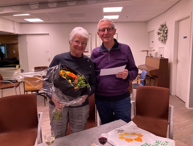 Geplaatst op:28-01-2024 Bijgewerkt op:28-01-2024 08:40 Een gouden Zonnebloemspeldje voor Ad VlooswijkBron: Mia Daniels, ZonnebloemAd Vlooswijk zet zich al 25 jaar in voor de Zonnebloem, eerst in zijn vroegere woonomgeving Heeswijk-Dinther, Uden en Veghel. En vanaf 2005 in Montfoort. Hij bezoekt gasten, gaat mee met rolstoelwandelen, begeleidt een van de gasten in een vaste rolstoel tijdens de uitstapjes en regelt de vaarvakanties. Ad heeft voor dit 25-jarig jubileum een gouden speldje gekregen van de Zonnebloem en Fien, zijn echtgenote, kreeg de bloemen. Zij werden ermee verrast tijdens de nieuwjaarsreceptie. Een welverdiend cadeau voor de jarenlange inzet van Ad voor de Zonnebloem.