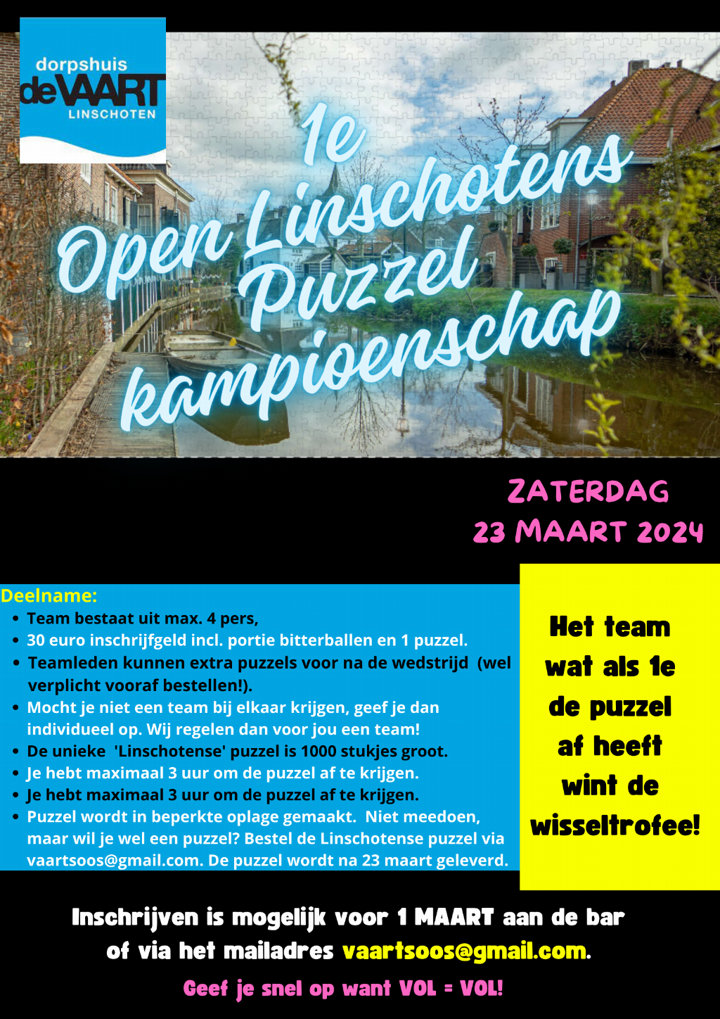 Geplaatst op:10-02-2024 Bijgewerkt op:10-02-2024 09:51 1e open Linschotens Kampioenschap LegpuzzelenBron: Eric Jan Hagoortop 23 maart a.s. vind in Dorpshuis de Vaart in Linschoten het 1e open Linschotens kampioenschap Legpuzzelen plaats. welk team maakt als snelste de unieke Linschotense puzzel? In samenwerking met de Linschotense fotograaf Chris Gottenbos is de foto uitgezocht. Geïnteresseerden die niet mee willen doen, maar toch een puzzel willen, kunnen deze op voorintekening bestellen via vaartsoos@gmail.com. De puzzels worden na 23 maart uitgeleverd.
