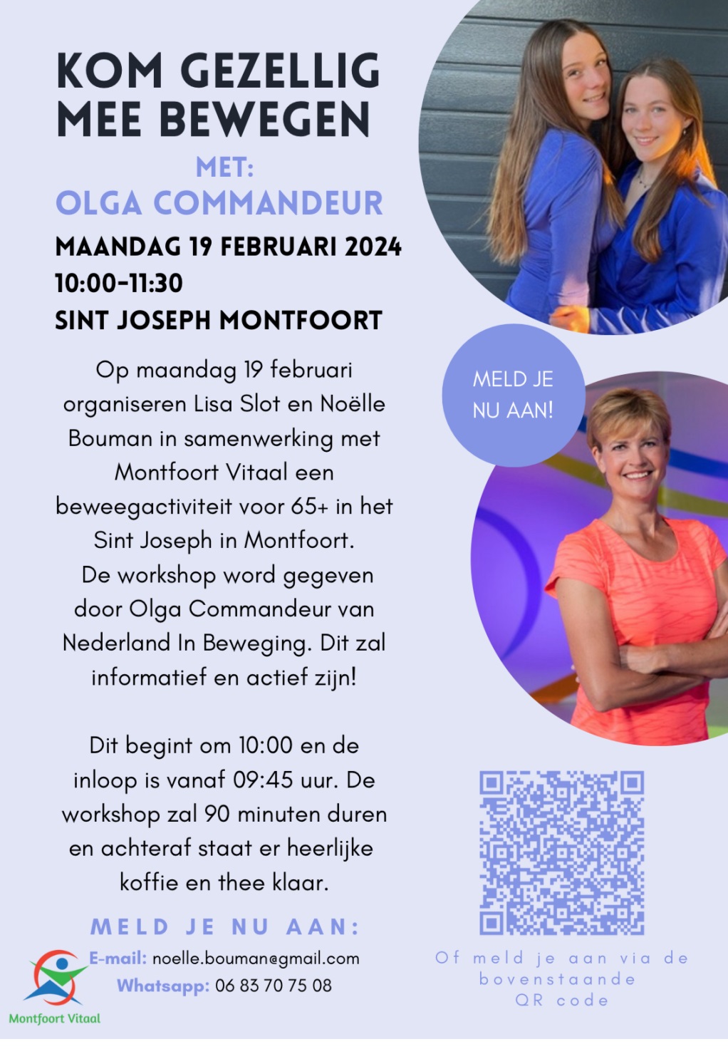 Geplaatst op:16-02-2024 Bijgewerkt op:16-02-2024 09:44 Kom gezellig meebewegenBron: Noelle Bouman en Lisa SlotWij (Noëlle Bouman en Lisa Slot) zijn bezig met een profielwerkstuk over: 'Hoe zetten wij 65-plussers meer aan het bewegen in Montfoort'. Naast ons onderzoek hebben wij ook een leuke beweegactiviteit voor 65+ georganiseerd in samenwerking met Montfoort Vitaal. Het is ons gelukt dat Olga Commandeur van Nederland in Beweging naar Montfoort komt. Het wordt informatief en actief. Wij hopen dat heel veel senioren komen mee bewegen! De activiteit is op maandag 19 februari 2024 om 10.00 uur in d St. Joseph in Montfoort. De inloop is vanaf 9.45 uur en het duurt 90 minuten. Na afloop staat er heerlijke koffie en thee klaar gesponsord door de vrienden van de soos. En deze activiteit is gratis. Wij hebben dit niet kunnen regelen zonder onze sponsoren: Profipack, Engeltherm, Van Wijngaarden Interieur, van den Pol Electrotechniek, H.J. Straver, Vrienden van de Soos, Huisartsenpraktijken Montfoort en het samenwerkingsverband MontfoortLinschotengezond!