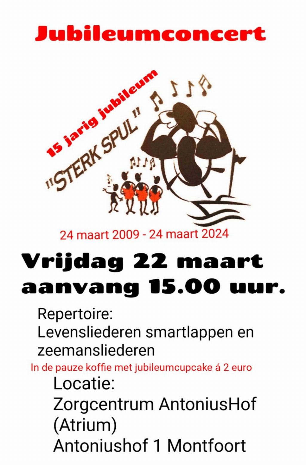 Geplaatst op:12-03-2024 Bijgewerkt op:12-03-2024 12:39 Jubileumconcert Sterk SpulBron: Zangkoor Sterk SpulDit jaar bestaat ons koor Sterk Spul uit Linschoten 15 jaar en we gaan vrijdag 22 maart 2024 aanvang 15.00 uur in het Atrium van het AntoniusHof in Montfoort een Jubileumconcert geven onder leiding van onze dirigente Helga Huisjes. Het is vrij toegankelijk en er is koffie te verkrijgen met jubileumcupcake á 2 euro in de pauze. Wij zijn een gemengd koor met 60 zangers, 5 accordeonisten, 1 slagwerker en bassist. We zingen zeemansliederen, smartlappen en levensliederen. Wij willen het gevoel van saamhorigheid dat we elke repetitie samen mogen ervaren delen met het publiek.