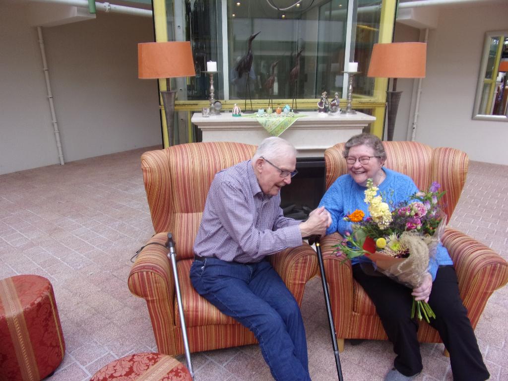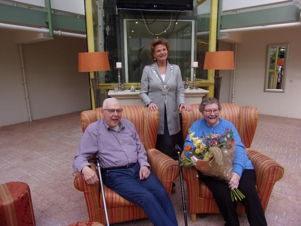 Geplaatst op:20-03-2024 Bijgewerkt op:21-03-2024 08:21 Briljanten huwelijk in MontfoortBron: Nettie Kuijer, redactie Radio Stad Montfoort19 maart 2024 waren Wim en Greet Van den Berg- Jansen 65 jaar getrouwd voor de wet. Het kerkelijk huwelijk volgde, in verband met de vasten, pas op 2 april. Burgemeester van Hartskamp bezocht hen thuis.  Fotomomentje in het atrium | Op 14 jarige leeftijd werkte Greet in het St. Jacob ziekenhuis te Oudewater. Als oudste in het gezin met zeven kinderen moest ze al jong haar steentje bijdragen. Daar leerde ze als zestienjarige Wim kennen die er werd behandeld aan struma. Het jonge paar werd verliefd, maar Wim was ziekelijk en Greet was bang dat hij “Geen blijvertje” was. Wie zou kunnen denken dat Greet en Wim nu al 65 jaar gelukkig getrouwd zijn. Op de vraag van de burgemeester “Wat is de kracht van een goed huwelijk?” antwoorde Greet glimlachend dat je moet toegeven en elkaar aan moet vullen.  | Onder het genot van een lekkere kop koffie uit de moderne machine werd er over reizen van vroeger verteld door het sympathieke stel. “Als of het gisteren was,” zei Wim. Vijf keer per jaar reisden ze naar Zwitserland, waar de zus van Greet een hotel had. Greet stuurde, Wim tankte en gaf koffie en brood aan. In het hotel werkte het stel mee, het was niet alleen vakantie. Vroeg in de morgen ging Wim dan al naar beneden om o.a. in de keuken te helpen. Greet werkte o.a. in de waskeuken en hotelkamers. Wim wandelde en fietste graag in Zwitserland. En een keer is hij er zelfs in vijf dagen naartoe gefietst!