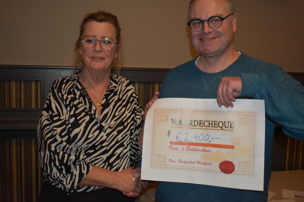 Geplaatst op:25-03-2024 Bijgewerkt op:25-03-2024 08:48 Zeer succesvolle actie voor het BakkershuisBron: G.A. (Gertjan) ScholtensOp zaterdag 23 maart is er in het zalencentrum Sint Joseph in Montfoort een bijzondere middag en avond georganiseerd. Er werd eerst een bridgetoernooi gehouden en daarna werd er gezamenlijk gegeten. Tenslotte was er tijd voor een loterij. Het doel van deze middag was het inzamelen van geld voor het Bakkershuis in Montfoort. Dat is een plek voor laagdrempelige dagbesteding ten behoeve van (beginnende) Alzheimer patiënten. Voor het bridgetoernooi hadden zich maar liefst 36 paren aangemeld. Men kon zich apart opgeven voor het diner daarna. Dat bleken maar liefst 77 personen te zijn. Nadat het toernooi was gespeeld, kon als winnaar het paar Kitty Verkerk en Ineke Rekelhof worden gehuldigd. Na afloop van het diner was het tijd voor de loterij, waarvoor de te winnen prijzen belangeloos waren geschonken door de Montfoortse middenstand. Dit alles werd georganiseerd onder de bezielende leiding van Hans Scheel uit IJsselstein. Hij is al jaren enthousiast lid van Bridgeclub Montfoort en draagt het Bakkershuis een warm hart toe.  Links Marion de Jong, coördinator van het Bakkershuis, rechts staat Wob Scholtens, voorzitter van Bridgeclub Montfoort. | Na afloop van de loterij kon Wob Scholtens, voorzitter van BCM aan Marjon de Jong, coördinator bij het Bakkershuis, een cheque overhandigen van maar liefst € 2.400,-. Het Bakkershuis is van plan om van dit geld het al bestaande terras eens flink op te knappen. Daarmee kan met recht worden gezegd dat de organisatie een succesvolle middag en avond heeft georganiseerd.