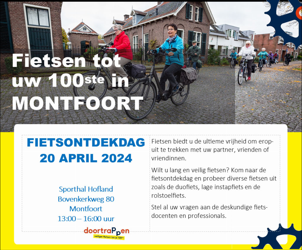 Geplaatst op:28-03-2024 Bijgewerkt op:28-03-2024 15:55 Fietsontdekdag in Montfoort 20 aprilBron: Persbericht SWOMFietsen zorgt ervoor dat senioren langer gezond, sociaal actief en zelfredzaam blijven. Tegelijkertijd zijn ouderen ook kwetsbaar in het verkeer. Het programma Doortrappen, een initiatief van het ministerie van Infrastructuur en Waterstaat, zorgt ervoor dat ouderen zo lang mogelijk kunnen blijven fietsen, oftewel veiliger fietsen tot uw honderdste. Op zaterdag 20 april 2024 wordt er een Fietsontdekdag in Montfoort georganiseerd. Gemeente Montfoort, Het Knooppunt, Montfoort Vitaal, Provincie Utrecht, Doortrappen en SWOM organiseren met elkaar deze dag. Kom naar deze dag en ontdek meer over veilig en met plezier (blijven) fietsen. Samen fietsen we beter Op zaterdag 20 april bent u tussen 13:00 en 16:00 uur van harte welkom in Sporthal Hofland, Bovenkerkweg 80 in Montfoort. Tijdens deze ontdekdag krijgt u informatie over de driewielfiets, de lage instapfiets, de duofiets en de rolstoelfiets. Onder het genot van een kopje koffie of thee kunt u uw vragen stellen aan de leveranciers van diverse fietsen, een fysiotherapeut, Wmo-consulent en fietsdocent. U kunt ook een proefrondje maken en de fietsen uitproberen. Wist u dat u uw eigen fiets om kunt laten bouwen naar een driewielfiets? Deze middag is informatief, er is dus geen aankoopverplichting en de toegang is gratis. Fietsen is plezierig, u blijft in beweging en fietsen geeft u vrijheid. Wilt u lang(er), gezond(er) en vooral veilig(er) blijven doortrappen? Kom naar de Fietsontdekdag en laat u informeren.