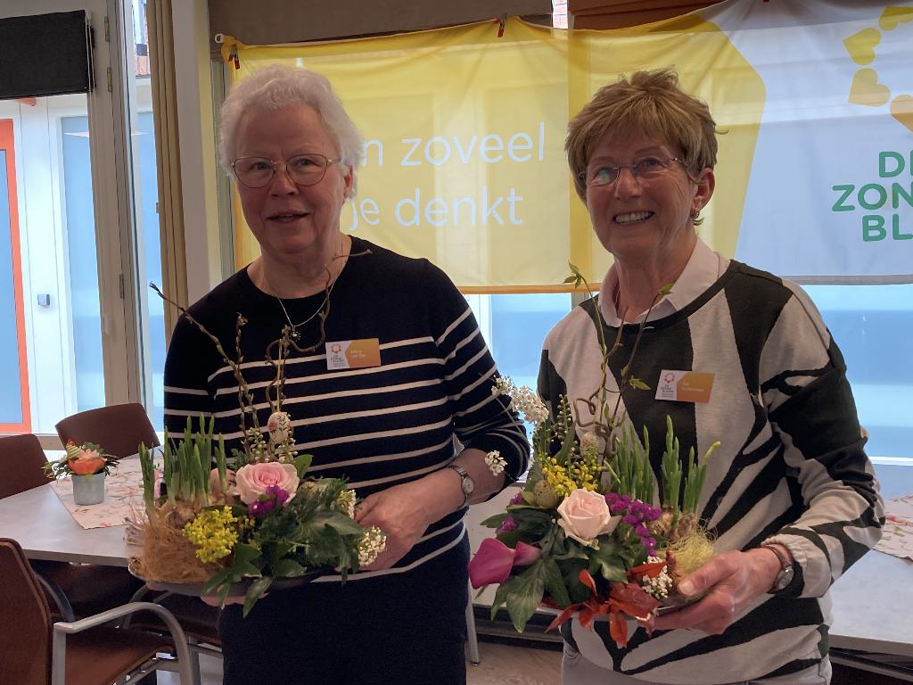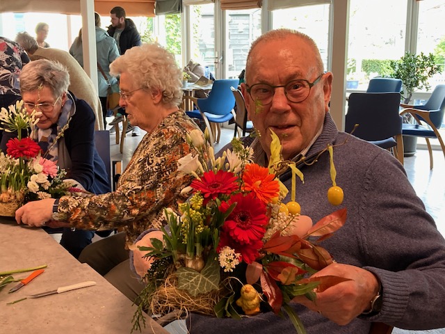 Daarmee zijn de 30 gasten druk bezig geweest. Ze hadden twee mooie voorbeelden, die door onze vrijwilligers Ria en Marry zijn gemaakt. We hadden ook een heer in ons midden. De heer Vernooij is vroeger jarenlang vrijwilliger geweest bij de Zonnebloem. Ook hij heeft een mooi bloemstuk gemaakt.