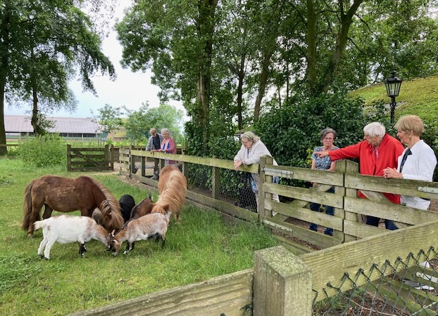 Het was rond 21 graden. Een fijne temperatuur om in een grote kring buiten op het terras te zitten. Mevrouw Van de Berg zorgde beide keren voor koffie en thee en de Zonnebloem voor de taart en frisdrank. Het was er sfeervol en gezellig. We hebben een wandeling gemaakt in de tuin met de vele kleuren hortensias en zijn ook naar de dieren achterin gegaan. Die kwamen naar de gasten omdat ze weten dat ze dan iets extra’s te eten krijgen. Altijd weer leuk om te zien.