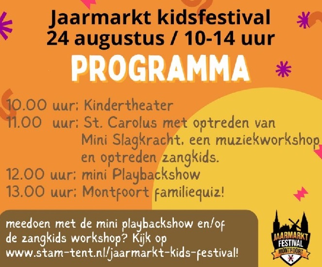 Meer info over bijvoorbeeld het opgeven voor de mini playbackshow en/of zangkids vind je op de website https://www.stam-tent.nl/jaarmarkt-kids-festival.