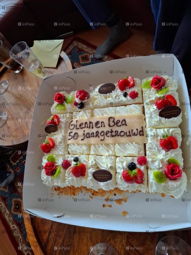 Er is een prachtige taart gefabriceerd die meteen moet worden aangesneden. Ook gaat de champagne rond om te proosten op het gouden bruidspaar.