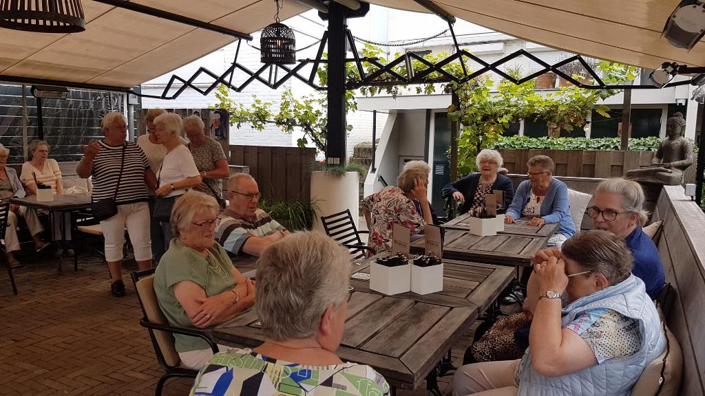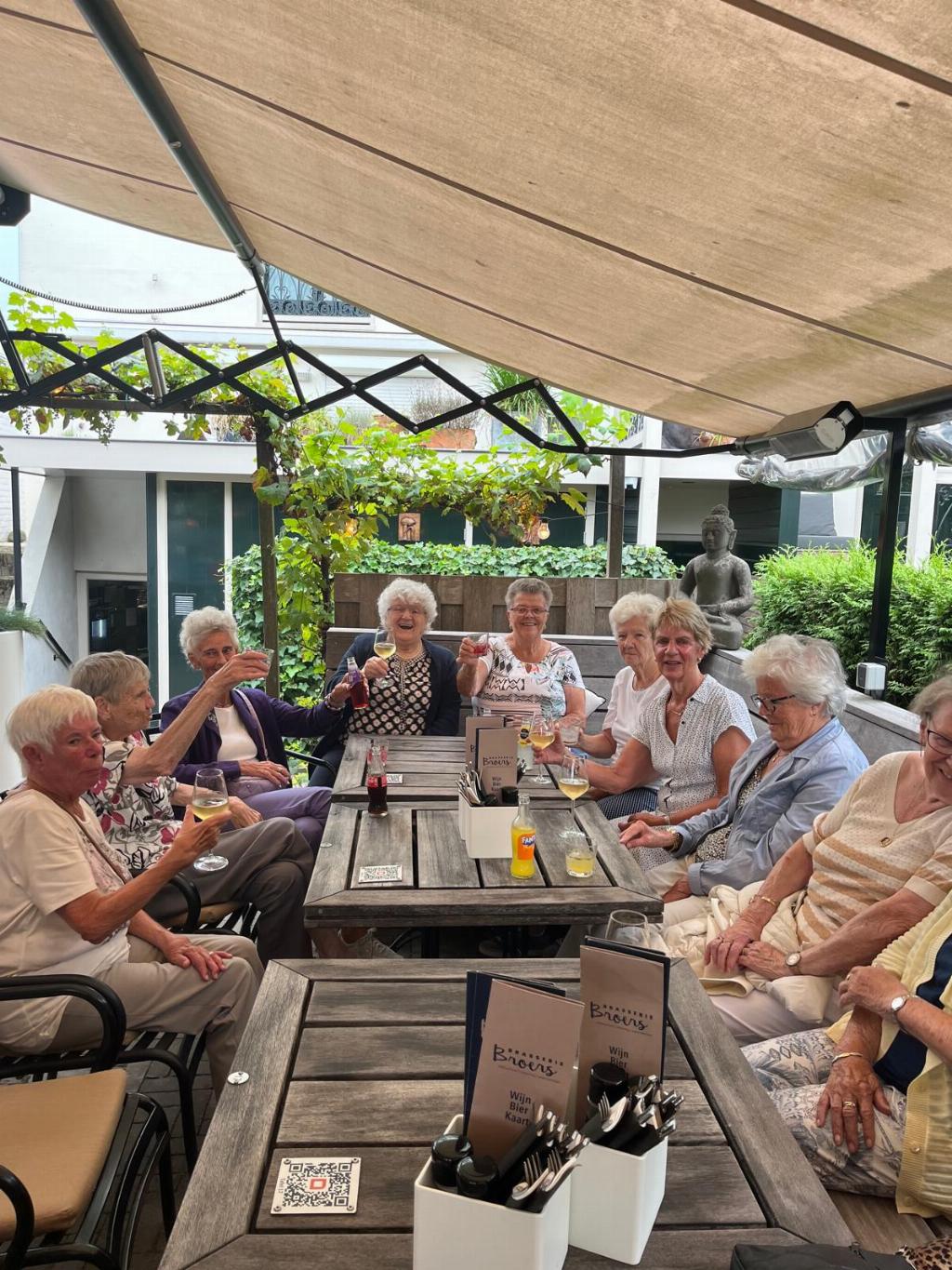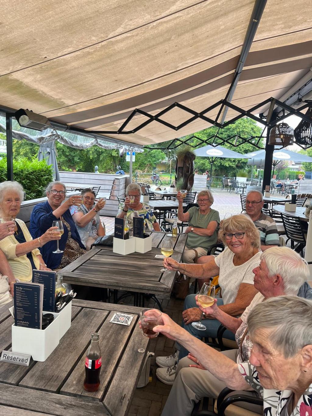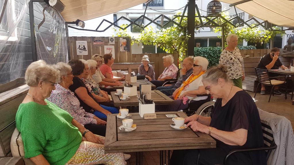 Geplaatst op:30-09-2024 Bijgewerkt op:30-09-2024 09:30 Genieten bij Brasserie BroersBron: Marlies van Hoegee (webbeheerder afdeling Zonnebloem Montfoort-Linschoten)Zonnebloem Montfoort Linschoten was maar liefst drie keer deze zomer een middag te gast bij Brasserie Broers Brasserie Broers We werden ontvangen op het grote terras met koffie, thee en door de broers Rob & Ronald zelf gemaakte taartjes. De vruchtentaartjes waren steeds verschillend, zagen er heel feestelijk uit en waren erg lekker! Natuurlijk werd er ook nog een glaasje wijn, fris of een biertje gedronken. Het waren drie gezellige middagen. De 36 gasten en de 12 vrijwilligers van de Zonnebloem Montfoort/Linschoten kijken er met veel plezier op terug.