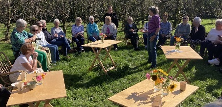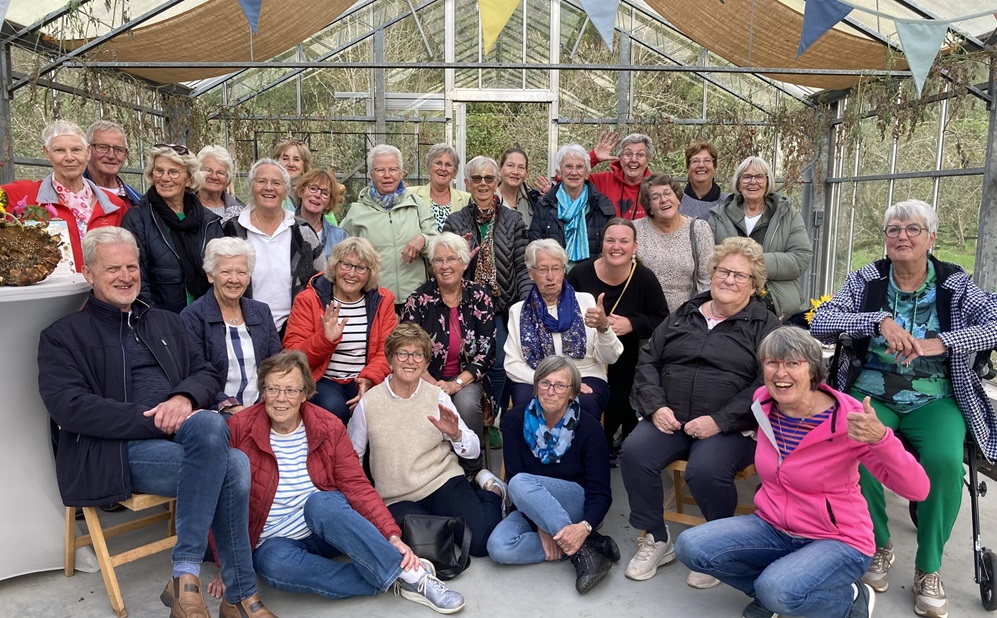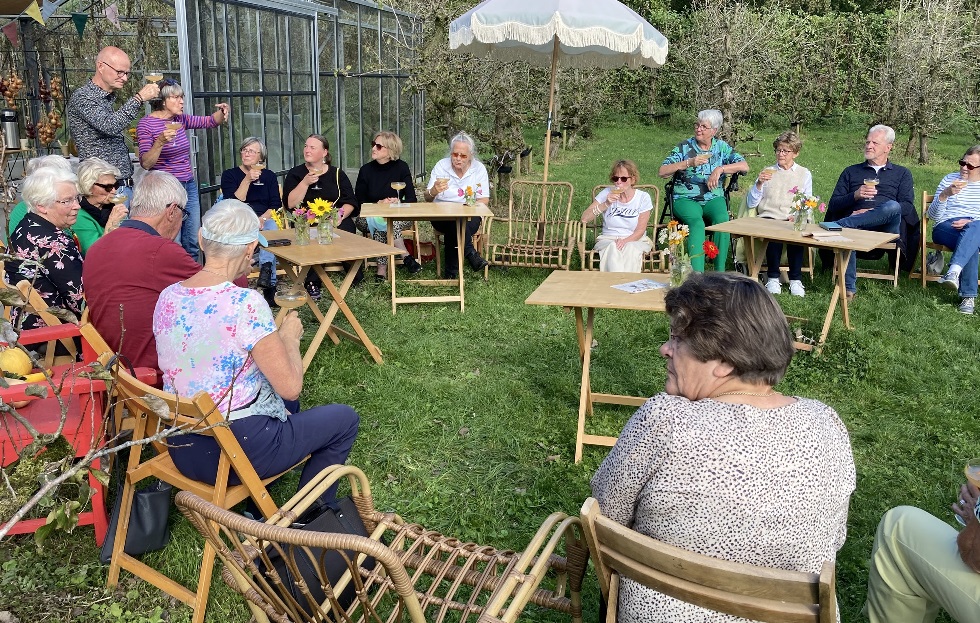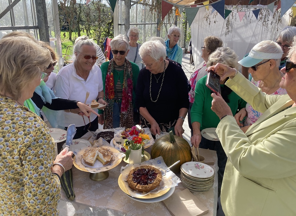 Geplaatst op:08-10-2024 Bijgewerkt op:08-10-2024 11:20 Vrijwilligersfeest van de Zonnebloem in de Proeftuin van Linschoten.Bron: Mia Daniels, Zonnebloem MontfoortDe vrijwilligers van de Zonnebloem uit Linschoten en Montfoort fietsten vrijdagmiddag in het zonnetje naar de Proeftuin bij het Landgoed Linschoten voor het vrijwilligersfeest. De kas was versierd met prachtige bloemen. Ook de zonnebloemen ontbraken niet. De zon scheen zo uitbundig dat we in een grote kring buiten in de boomgaard konden zitten. De vrijwilligers werden welkom geheten door gastvrouw Natasha en door voorzitter Mia Daniëls. Er werd afgetrapt met koffie/thee en heerlijke taart. Vervolgens werd er een toost uitgebracht op de inzet van de vrijwilligers! Zij zetten zich het hele jaar in voor de 130 gasten met activiteiten, uitstapjes, 13 keer rolstoel wandelen, vele bezoekjes en voor 2 gasten ook een vaarvakantie. Er werden rondleidingen door de tuin gegeven. Ook was er een buffet met hartige taart, salades, brood en soep. Iedereen heeft genoten en was erg enthousiast over de ontvangst van gastvrouw Natascha en het feest in de sfeervolle Proeftuin.