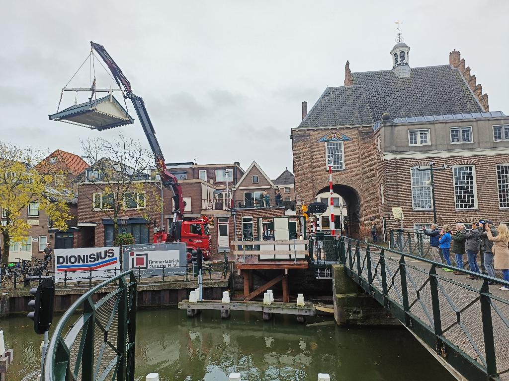 Geplaatst op:23-10-2024 Bijgewerkt op:23-10-2024 08:29 Opgeknapt brugwachtershuisje weer terug op de oude plekBron: Peter VerslootOp de vroege ochtend van 21 oktober 2024 is het brugwachtershuisje weer op zin oude plek teruggeplaatst. De kozijnen werden op het nieuwe gemaakte platform in elkaar gezet en het herstelde dak werd met een takelwagen op de kozijnen gezet.  |  | Rond de middag keek initiatiefnemer Stichting Hugo Kotestein trots en tevreden terug. Met hulp van vele vrijwilligers en bedrijven is dit beeldbepalende huisje opgeknapt en hersteld en staat het dik in de lak te glimmen naast de eerder vernieuwde brug. Een nieuwe functie is er ook: het wordt het honk van de sluiswachters.