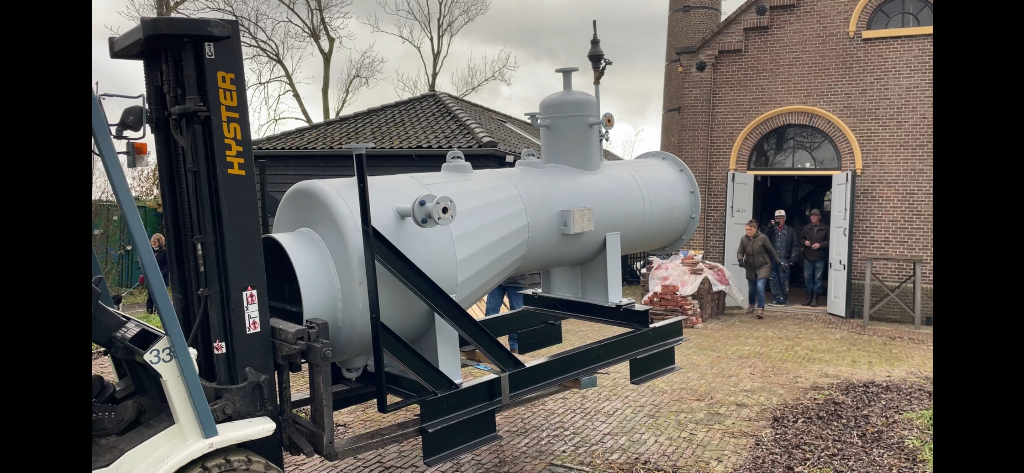 Geplaatst op:23-11-2024 Bijgewerkt op:23-11-2024 09:26 Nieuwe stoomketel gemaal Kamerik-TeylingensBron: Stichting Watererfgoed Groot WoerdenVrijdag 22 november 2024 is bij stoomgemaal Kamerik Teylingens een gloednieuwe stoomketel afgeleverd. De afgelopen jaren draaide het geheel gerestaureerde stoomgemaal niet op stoom, maar op perslucht. Met de nieuwe ketel kan het gemaal in de toekomst weer echt op stoom draaien! In de periode vanaf 2008 zijn de stoommachine zelf, het gebouw en de schoorsteen gerestaureerd. In 2019 is de kolenloods herbouwd volgens de oude tekeningen. Maar de machine kon niet op stoom draaien, omdat de oude ketel in de jaren zestig is afgevoerd. Om de stoommachine toch te kunnen gebruiken was een elektromotor geïnstalleerd. Natuurlijk wilden de vrijwilligers van het gemaal ook de stoomketel weer in ere herstellen. Daarvoor werd in de afgelopen jaren financiering gevonden. Het fonds Erfgoedparels, HDSR,VSB-fonds Woerden en enkele particuliere sponsors maakten het mogelijk dat eind 2023 een groot project van start ging om een nieuwe stoomketel te ontwerpen en te laten bouwen. Alle voorbereidingen zijn getroffen voor de komst van de ketel, inclusief de fundering waarop hij geplaatst wordt. De komende maanden worden alle aansluitingen gerealiseerd en wordt het leidingwerk afgemaakt. Als alles goed gaat, kan er vanaf april écht met stoom getest worden.