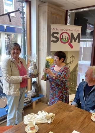 Bestuursleden Lex van Wijk en Peter Gruters overhandigen samen met gastvrouw Marga Hoogendoorn aan mevrouw Donker  een voorjaarsbloemetje en een Montfoorts streekpakket. Donker.