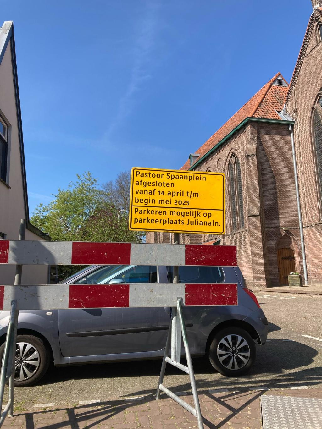 Op het Pastoor Spaanplein vernieuwen we de weg en parkeerplaatsen. U kunt tot de werkzaamheden afgerond zijn tijdelijk parkeren op het terrein aan de Julianalaan naast de begraafplaats.