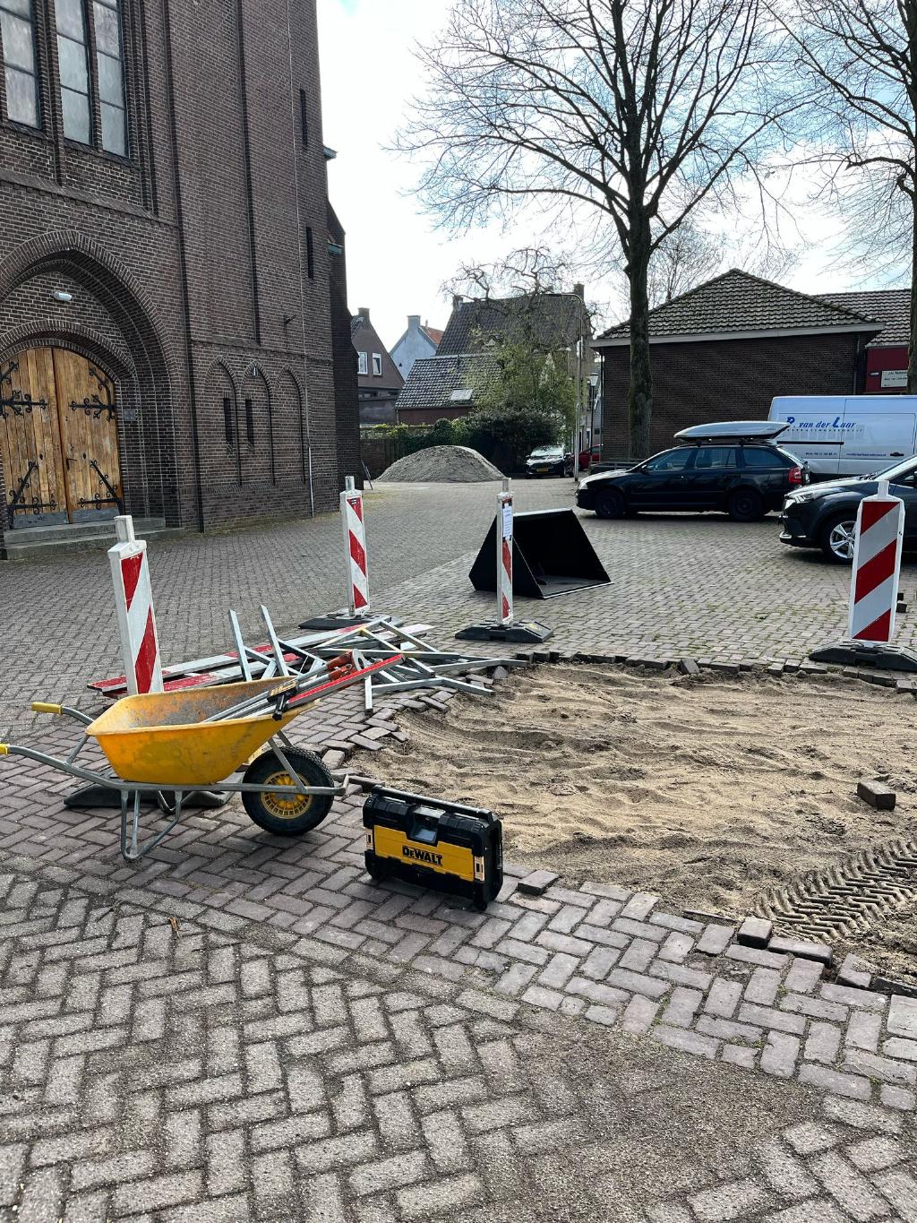 Maandag 14 april zijn de bestratingswerkzaamheden gestart op het Pastoor Spaanplein. We bestraten de weg en parkeerplaatsen opnieuw. Ook leggen we de parkeervakken opnieuw aan. Deze krijgen een witte markering van klinkers, zodat de parkeerplekken duidelijk zichtbaar zijn. De werkzaamheden duren ongeveer één maand. Dit hangt af van het weer. U mag het terrein aan de Julianalaan tijdelijk gebruiken als parkeerplaats.