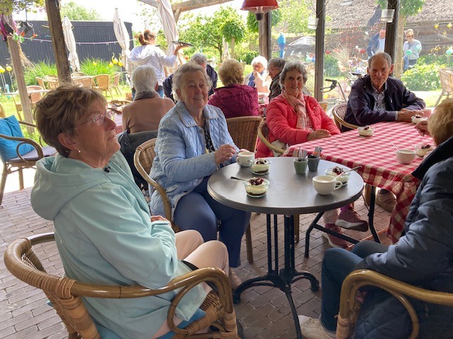 Na een uur komt de trein aan bij Theetuin de Kwakel. Daar zaten we dit keer onder de overkapping vanwege de koude wind heerlijk te smullen van kersenmonchou gebak en een drankje of ijsje toe. De gasten hebben genoten van elkaars gezelligheid en het bijzondere uitstapje.
