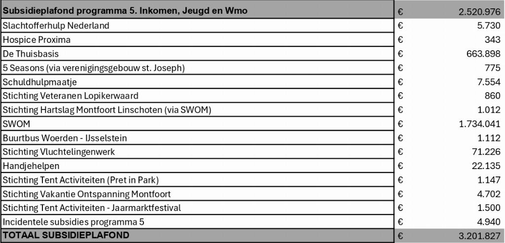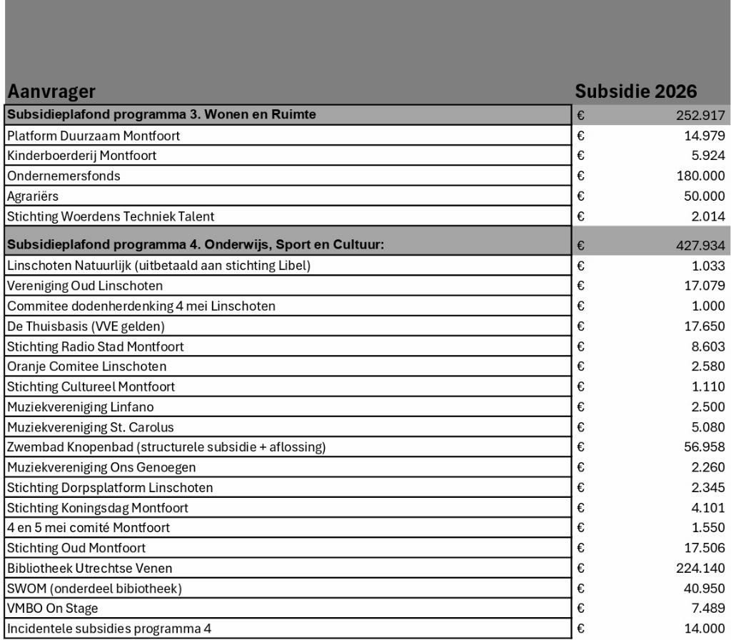 Tijdens deze periode kunt u een zienswijze indienen. Het concept subsidieoverzicht 2026 vindt u in de tabel hieronder en ligt bij de receptie van het Huis van Montfoort.