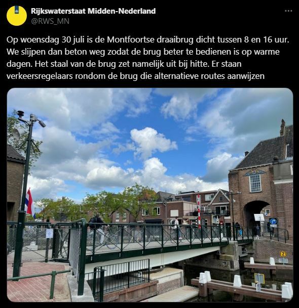 Geplaatst op:30-07-2025 Bijgewerkt op:30-07-2025 09:56 Werkzaamheden draaibrug 30 juliBron: Gemeente Montfoort Woensdag 30 juli werkt Rijkswaterstaat aan de draaibrug. Daardoor is de draaibrug tussen 08:00 tot 16:00 gesloten voor al het verkeer. Dat geldt ook voor het vaarverkeer.