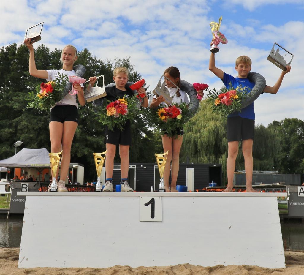 Geplaatst op:25-08-2025 Bijgewerkt op:25-08-2025 08:20 Snacker Dekker Bokaal Zegveld 23 augustus 2025Bron: Polsstokbond Holland Records en waterballet, de Snacker Dekker Bokaal was een groot succes. Na een mooie zonovergoten dag, waarop ook het NK Jeugd werd gesprongen, mochten de Hollandse toppers zich opmaken voor een van de laatste wedstrijden van het seizoen. De maand augustus, de maand waar de grote prijzen worden verdeeld, zit er bijna op. Het is zaak dat de springers nu in de vorm van hun leven komen. En dat dat bij de meeste springers wel goed zit bleek deze avond wel. Voor of tijdens de wedstrijd nog even een patatje halen bij de wedstrijdsponsor, dan moest het goedkomen werd gedacht. Dames Bij de dames is het springgeweld aardig losgebarsten dit jaar. Een 16-meter sprong is vaak niet meer genoeg voor de winst. De laatste weken zijn er al flink wat records gesneuveld, dus ook vanavond waren de verwachtingen hoog. Klassementsleider Tessa Kramer (Schoonhoven) wist deze verwachting meer dan waar te maken. Zij wist al in haar eerste sprong te komen tot 17,89m. Dit betekende niet alleen een nieuw persoonlijk record, maar ook een nieuw schansrecord! Met deze mooie afstand wist zij het oude schansrecord uit 2016 ruim te verbreken en liet zij zien klaar te zijn voor de Nederlandse Kampioenschappen. 2e werd kersvers Nederlands recordhoudster Joriene Baas (Oudewater) met een afstand van 15,64m en 3e werd Suzanne Mulder (Vlist) met 15,22m. Senioren In de eerste helft van het seizoen waren het vaak dezelfde springers die de wedstrijd bij de senioren wisten te winnen. Nu het seizoen haar einde nadert en alle springers in vorm komen is het wat vaker stuivertje wisselen. Jaco de Groot (Woerden) beet het spits af door in zijn eerste sprong direct 20,88m op de borden te zetten. Dit bleek een podiumwaardige afstand, hij werd 2e . De enige man die deze avond de 21-meter grens wist te passeren was Rian Baas (Gouda). Met 21,29m was hij veruit te beste in het sterke deelnemersveld. Dankzij een paar machtige klimslagen en een ferme uitsprong kreeg hij het publiek op de banken. Het podium werd compleet gemaakt door Daniel Cluistra (Haastrecht). Met 19,88m wist hij dichtbij zijn persoonlijke record te komen. Junioren Ook in deze categorie leek de laatste weken de spanning weer helemaal terug te zijn. Daar waar klassementsleider Harmen Bogaard (Polsbroek) nagenoeg alles won wat er te winnen viel, lijkt de concurrentie de laatste weken in de laatste weken toch wat aan te haken bij zijn springgeweld. Daarom deed Harmen wat hij moest doen: De wedstrijd naar zijn hand zetten en laten zien dat hij terecht in het leiderstenue springt. Met 18,77m pakte hij dan ook de eerste plek en liet de concurrentie ruim achter zich. De overige plekken waren voor de gebroeders Kastelein. Arien Kastelein (Zegveld) wist de 18-meter grens te passeren en kwam tot 18,25m, een 2e plek voor hem. 3e werd Jorian Kastelein (Zegveld) met 17,12m. Jongens De jongens zijn aan elkaar gewaagd. Vele springers hebben het in zich om een wedstrijd te winnen. Voor het publiek dan ook een prachtige groep om te volgen! Deeerste jongen die deze avond 17-meter grens wist te passeren werd Joël Nap (Linschoten). Met 17,69m wist hij dat deze afstand finalewaardig was. Maar zoals gezegd: de concurrentie is hevig, dus tot de laatste sprong was het spannend. Uiteindelijk bleek een 2e plek het hoogst haalbare voor Joël. Het was namelijk thuisspringer Thomas Meijer (Zegveld) die zijn persoonlijke record aan diggelen sprong en met een afstand van 17,93m de overwinning opeiste. 3e werd Martin den Boer (Wilnis) die op 16,75m in het zandbed landde. En sterke avond voor de jongenscategorie, want nog 2 springers die buiten de prijzen vielen wisten wel hun persoonlijke records te verbreken. Meisjes Voor de meisjes leek het deze wedstrijd soms wel erg op een waterballet. Door een zijwind/ tegenwind was het even zoeken naar waar de stok in het water moest staan. Dit wist Nina van Eijk (Vlist) het beste te doen en haar eerste afstand van 13,55m was ook direct de winnende afstand van de avond, In de finale kwam klassementsleider Gemma van Oosterom (Woerdense Verlaat) nog dicht in de buurt, maar met 13,53m moest zij genoegen nemen met een 2e plek. Liesbeth Verdoold (Polsbroek) laat de laatste tijd zien dat ze grote stappen vooruit maakt. Deze avond bracht 13,01m haar naar een 3e plek. En zo was de avond weer voorbijgevlogen. En de springers weten ook: het seizoen is bijna voorbijgevlogen. Want volgende week staan er nog 2 belangrijke wedstrijden op het programma, daarna resten enkel nog wat clubkampioenschappen voor de meeste springers.